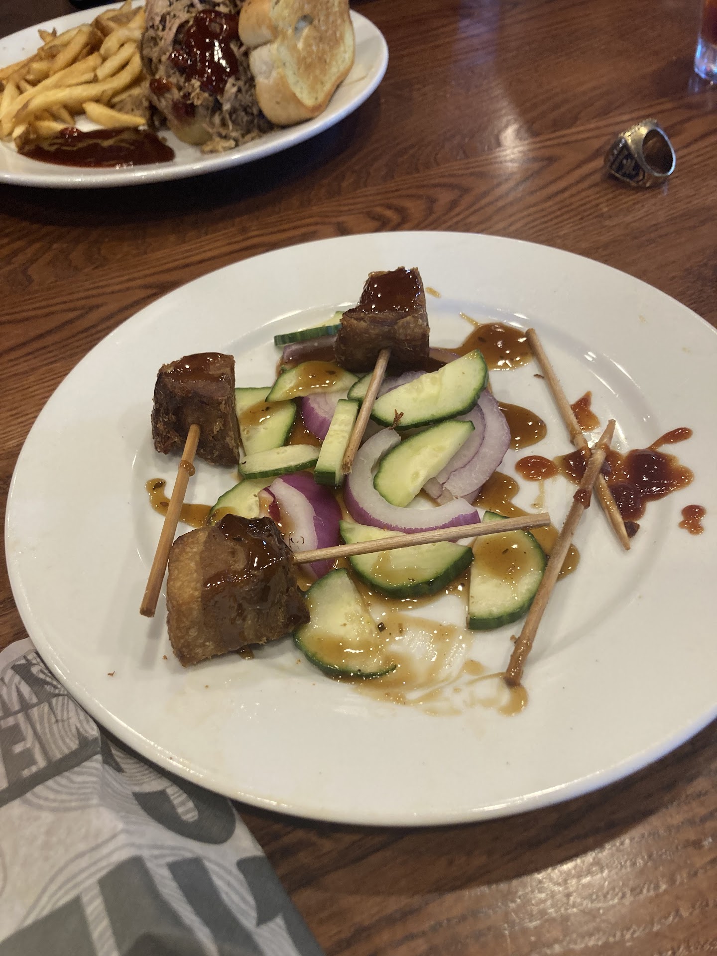 I just ate here with my family. There were 15 of us. The worst thing was the service. I’m a server myself and a good rule of thumb is that when you have a large party, either assign it to one strong server or two average servers. We got one weak server, Aaliyah. She was a nice young lady and she had a positive attitude. However she was very disorganized and seemed to not have much experience waiting on large parties. She would take a long time between coming back to the table. We were not given any silverware until we already had our food for about 5-10 minutes. No one was given a refill proactively. All of the wings were given to us with no blue cheese or ranch. She didn’t even ask which one we wanted while taking the order. While we were trying to ask for condiments, refills, napkins, etc, she would only get 2-3 peoples request at one time. If you’re a strong server and are good at organizing, you ask the entire table for their needs at once, then retrieve everything at once. This makes for the customers getting everything they need quickly and makes your job easier so that you don’t have to keep running back and forth. Thank God for the young lady who was helping her run the food. I wish I knew her name because she truly saved the day and had we had her as a server from the beginning I’m sure we would’ve had a better experience. She was quick and organized how a good server should be. My family and I wanted to order some more drinks and to go meals, but the original server was so slow and disorganized that we didn’t even bother. For the food, it was average at best. They were out of brisket, which 3 of my family members wanted to order. The star of the show were the smoked wings BUT they’re “not allowed” to toss them, so the wing sauce comes on the side, which takes away from the experience of eating wings. Literally all of the other food from the pulled pork, to the nachos, to the burgers were very average. One of the pictures I provided was the pork belly appetizer, which sounds really good in the description, but was extremely disappointing. The “Asian salad” was literally some sliced cucumber and red onions. The pork belly was just stuck on some skewers with a light drizzle of bbq sauce. What a joke. The atmosphere of the restaurant is nice but it was hot inside and the floors were extremely slippery, to the point that it was an obvious safety hazard. Overall, i wouldn’t recommend coming with a large party. The smoked wings are good, but that’s about it and you’re better off...