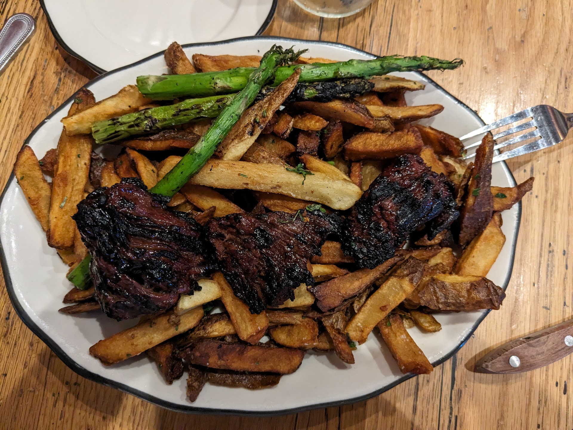 What I got was a massive plate of french fries, four asparagus spears and three steak tips sitting on top. Honestly I was shocked by the proportions. I'd ordered steak tips with a side of fries and what I got was fries with a side of steak tips. I looked under the fries to see if there were more tips, but there weren't any. The attached pictures will give you an idea of the lopsided proportions.