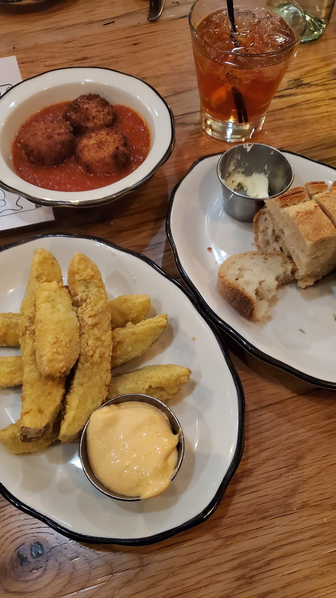 The food and drinks: We started with the fried pickles and the provolone arancini balls. The fried pickles were whole spears that were battered. We both had issues eating them because the batter fell off and the actual pickle was extremely hot. It was just awkward eating a whole battered pickle spear. The arancini (3 in order) weren't bad, but they were a little dry even with the sauce. For the main dishes, I ordered the fried chicken sandwich with the homemade chips and my husband got the burger with fries. We both cut our sandwiches in half to share. We liked the fried chicken sandwich a lot, it was very flavorful with a good pairing of toppings. The homemade chips were ok, then seemed a little overfried, but not bad. The burger was pretty good also, very juicy (although the pattie was on the thinner side) but the cheese was melted nicely and the bun was delicious. The fries were also good as they were seasoned with some fresh herbs and spices. I think we both agreed that the bread they served upon arrival was amazing, especially with the whipped butter. I didn't have an alcoholic drink, but my husband ordered an old fashioned. This is common drink he'll get when we go out and he usually likes it, but he said that he was underwhelmed by it, as the flavors didn't mend well and the garnish wasn't enough. Overall, the food was good. I'd maybe suggest either cutting the pickle wedges thinner or into chip slices. And for the old fashioned, perhaps a better garnish and a little tweaking with the ingredients.