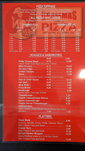 I hate to say this, but I don't think they're going to be around too much longer. They're too cheap to hire another pizza delivery person, and they work her to death, so you can always expect your pizza to be at least an hour late, & it's not even her fault.(That's no exaggeration. I've literally never had a pizza arrive in less than an hr, from ANY Grammas location). If you get delivery, they charge you a $5 delivery fee, and they don't even give it to her, from what I hear, and now they're charging certain customers, OVER $7 for delivery, and I don't know why because I honestly don't live that far. At any time that you call them, it's always some new restriction. For ex., I called tonight(Saturday )and the guy that answered said, we are only doing pizzas and salads tonight. I laughed and said, "it's always something with u guys", then politely hung up. I could go on and on about the place, but I don't feel like writing a book, & I think most of the employees are great. I just feel like the owners take advantage of being one of the only restaurants out...