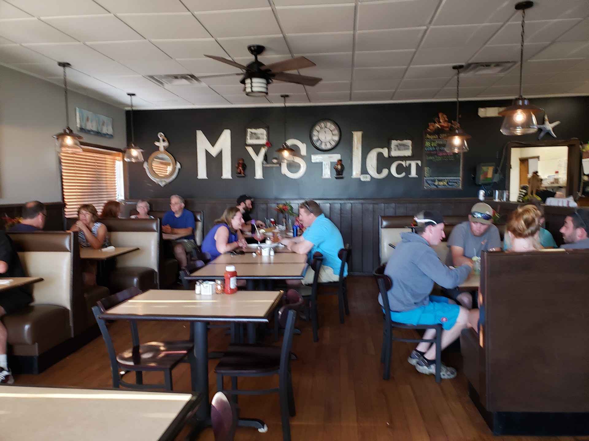 Read moreMy partner and myself, who aren't from the area, were on our lunch break & wanted to find a local place rather than the usual fast food. We happened to be driving by Angie's & thought that it looked promising, so in we went. We seated ourselves in a booth and were promptly attended to by our waitperson who supplied us with menus & took our order for drinks while we perused their offerings. I had initially thought about getting a pizza, but thought we might not have time since our break is only 30 minutes. So I ordered the "Black & Blue" burger platter (cajun blackened burger with blue cheese, lettuce & tomato, with fries & a side of coleslaw). I asked if I could add bacon to it, which our waitperson said was no problem. She also asked how I would like the burger, which always makes me happy- I'm a confirmed carnivore & like all my beef cooked medium rare whenever possible. My partner ordered the chicken parmesan sandwich platter, with fries and coleslaw also. The food arrived relatively quickly (about 15 minutes or so). My burger was quite tasty, and cooked exactly as I requested. My partner raved that his chicken parmesan sandwich was one of the best he had tried in quite some time. I asked our waitperson when I saw her again if we could have separate checks, which she said was no problem. My partner's came out right around $15 for his sandwich platter & drink, while mine was a little more (due to adding bacon) at around $17.50. All told, we were extremely happy with our food & service- about twenty bucks each (including gratuity), and quick enough that we were in & out in slightly over 30 minutes. So just about perfect! Would recommend to anyone looking for a reasonable sit down lunch or dinner option in downtown Mystic- two...