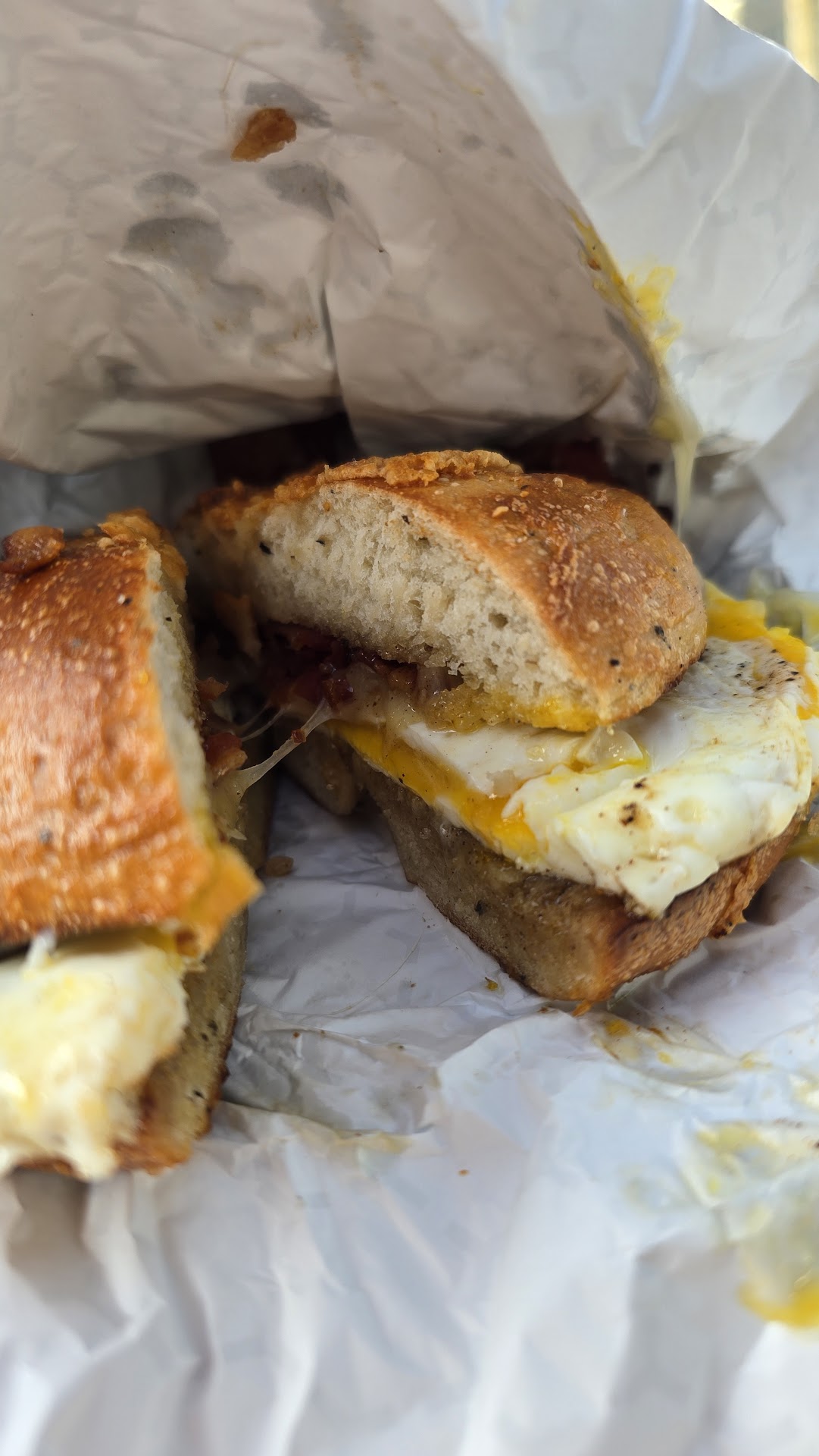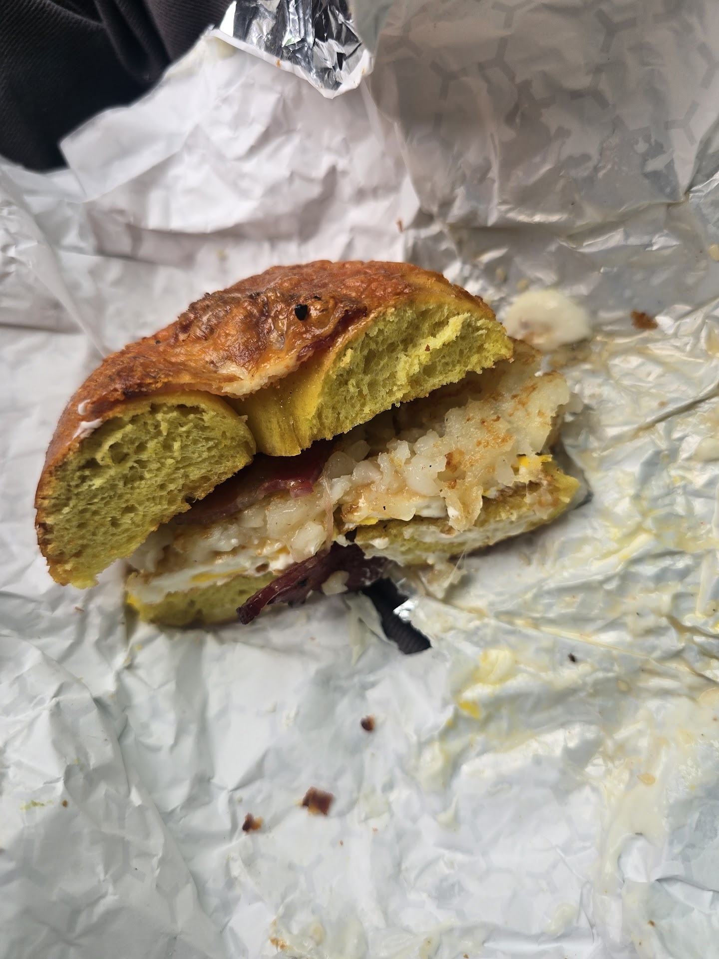 The bagel options are hand rolled / divine. Sandwich options are tasty creative—I got the hot boi with sharp cheddar, house made hot honey and bacon.