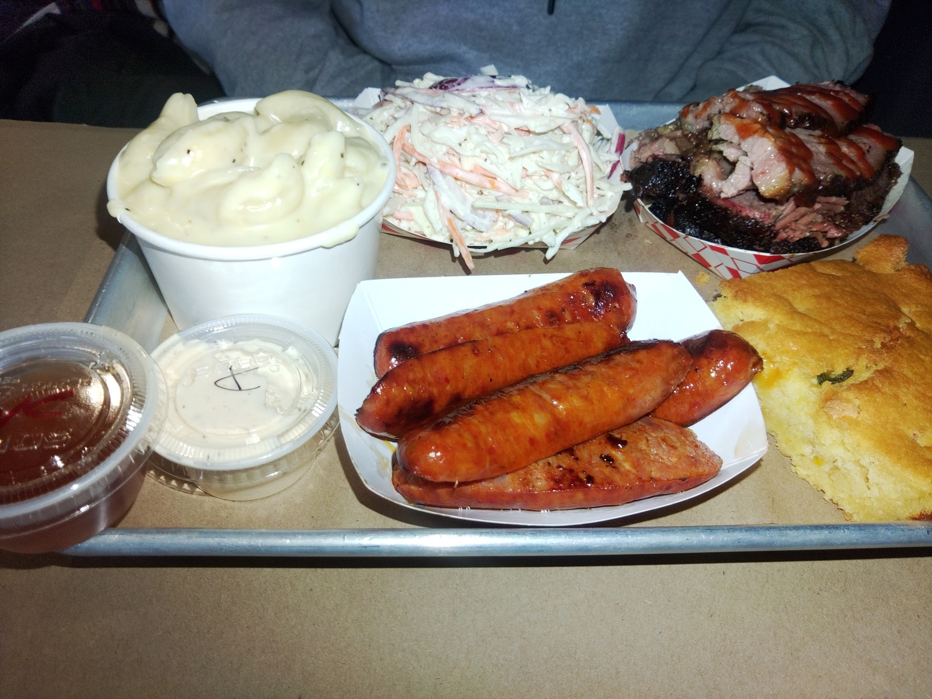 Food: [I got the combination which was $36. You get 2 meats, 2 sides and 2 sauces and jalapeƱo cheese cornbread]
