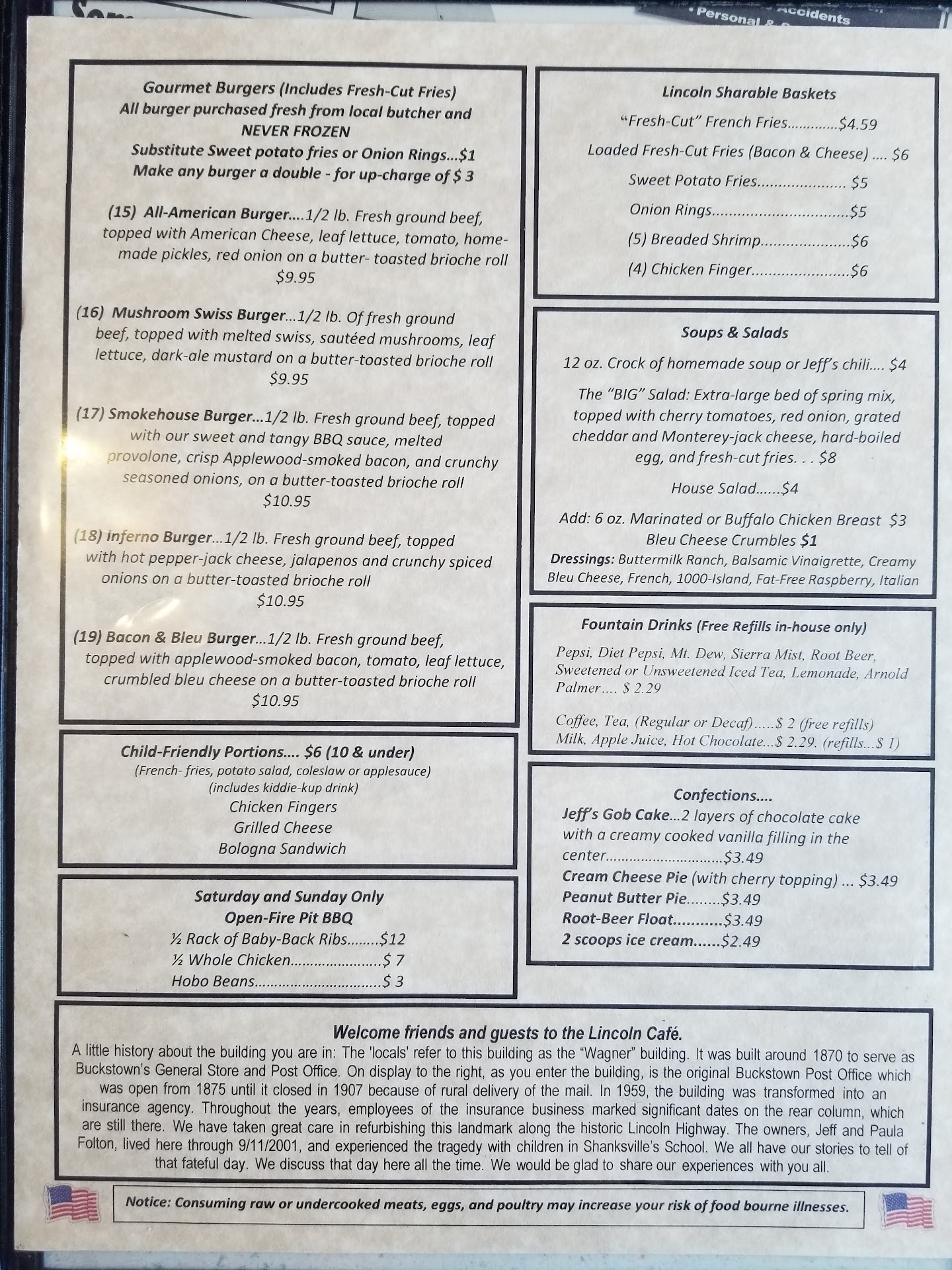 Read moreNearest Restaurant to Flight 93 Memorial. Serves lunch 11:00am - 4:00 pm weekdays, 11:00 - 8:00 on Weekends. Closed Wed.11:00. Casual setting. Inside seating for about 20 with plenty of outdoor picnic benches. Order food inside and carry outside on trays, or inside Table Service (if available). Food served in baskets with drinks from cans (with ice in cup) or from pitchers. Affordable prices with good quality food. I had "Smokehouse BBQ burger" with fries. Fries were fresh cut with skins and seasoned. Excellent! Hot and crunchy outside with creamy insides! Burger was hand-shaped 1/2 lb tender and juicy with Onion Ring and well flavored BBQ sauce. Best burger I've had for a while! Given its proximity to the Flight 93 Memorial it is...