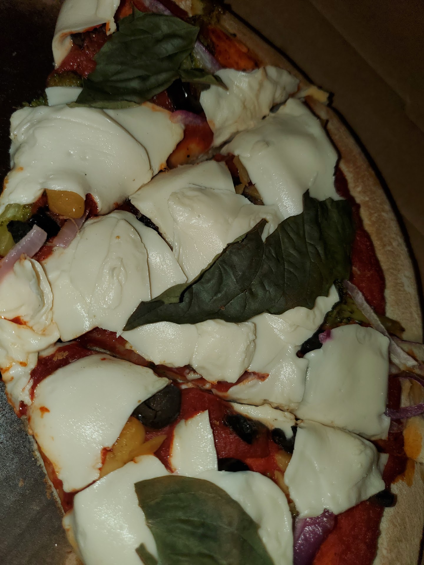 Read moreAttention Vegans/Lactose Intolerants: I got a "build your own" 12" vegan pizza. The overall flavor was good, but the vegan cheese wasn't what I was expecting. It wasn't bad persay, and with the fresh basil I added it gave it a Margherita-style vibe. But it wasn't melty at all and instead of shreds it looked like ripped up slices placed on top of all the other toppings as an afterthought. Never had vegan cheese quite like this, so I'm wondering if they make it in-house? As a lifelong vegan I know that some vegan cheeses don't melt too well, but these days there are lots of great melty options I've had at other local spots. And I'm confused about why slices and not shreds?? Once I got over it not being the melty, gooey pizza experience I was craving it really wasn't bad, it reminded me of fresh mozzarella kind of. The broccoli sicilia topping was delicious, but for $2 extra it barely had any on there. I also added roasted garlic and red onion which gave it a great flavor and helped matters. I got delivery, so maybe that had to do with it? Not sure if it's supposed to be like this or they were just lazy with adding the toppings and melting the cheese...would try again but maybe order over the phone or go in person instead of Doordash so I can ask some...