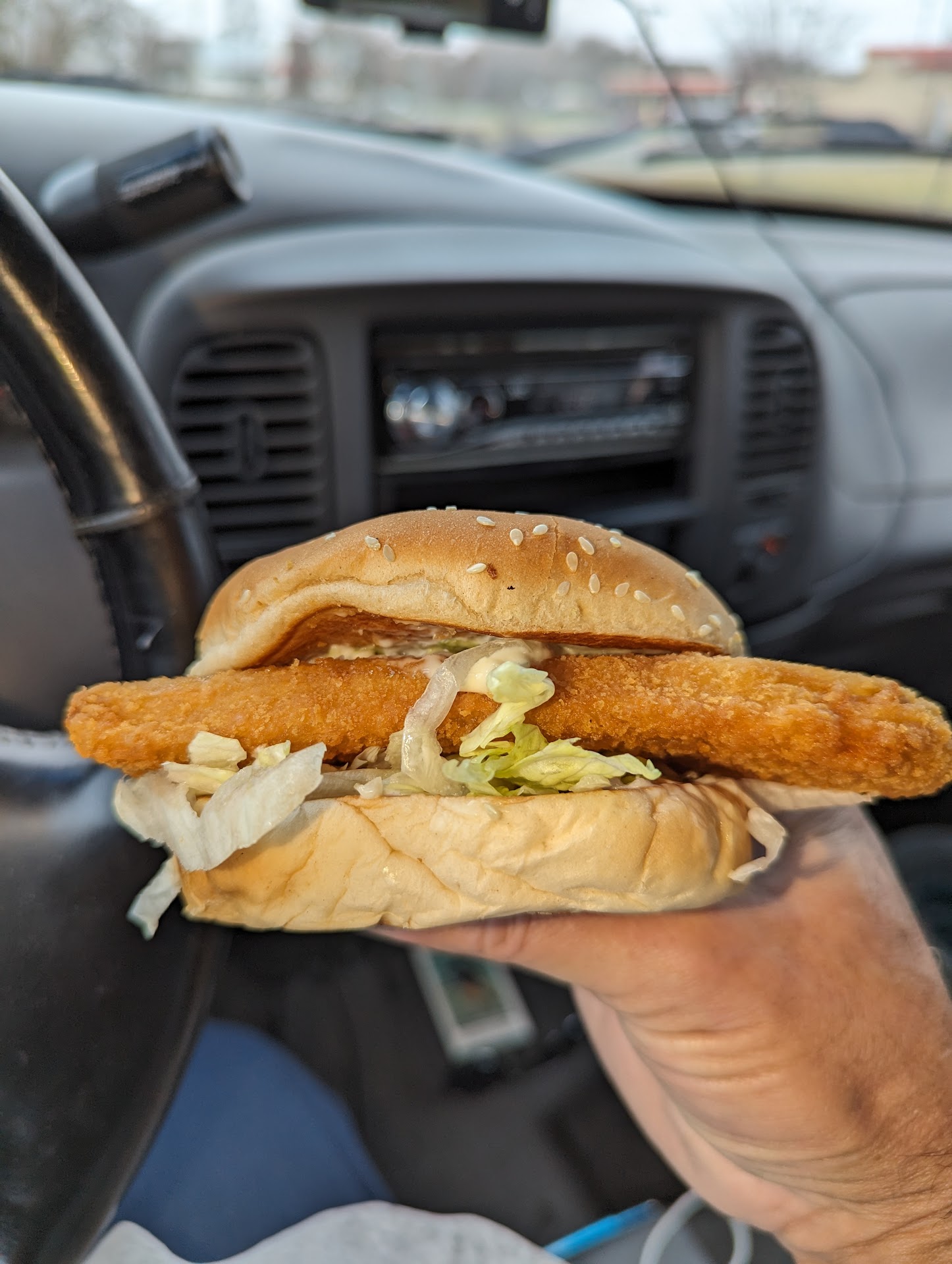 Read moreOnce again got off work. Went to drive through at Arby's. Got two crispy fish sandwiches..... They were the bomb. Nice golden brown hot. Very tasty. Can't go wrong with these sandwiches. If you haven't tried them yet, I strongly suggest you do. This is a totally different view but I'm new at this. I don't know how to make this separate from a previous one so just bear with me... Today is Thursday, March 21st. I went to Arby's got my favorite two fish sandwiches and I was told today would be the last day because they cannot get any more from their supplier. That saddens me because to me these were the best sandwiches they had on the menu. So again five stars for food and service... The fish sandwich that I'm holding in my left hand was the one I got today for...
