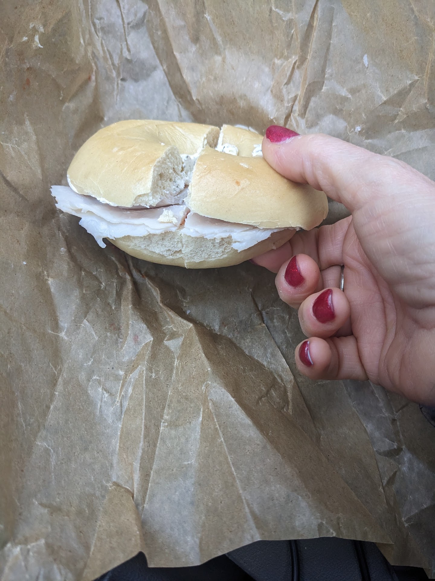 We got barely toasted bagels. I got the ham and American on mine. My wife got the Swiss and not well done bacon with mustard on hers. We tried to switch them around to correct their mistake but it was a mess because of the melted cheese. Very disappointing for $17 (inc tip).