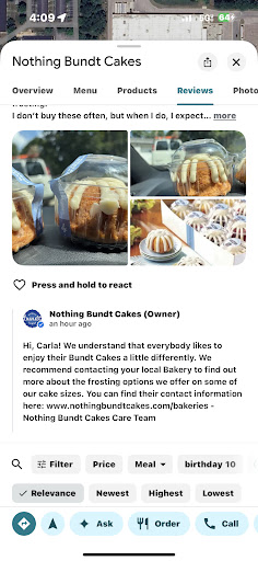 Ā Ā Ā Read moreWOW! Exceptional customer service. This weekend I ordered a cake from Nothing Bundt Cakes for a birthday party. I sent my boyfriend to pick it up and when he came home, I instantly realized it was not the correct cake. I called the bakery and they let me know that there were two orders for my last name and they did not verify the first name on the order which was the reason for the mix up. I said I would be in to pick up the correct cake in a few hours. I then received another call from a woman named Nicole who asked if she could deliver the correct cake immediately...WOW. We we're blown away by the action. All of this to say that we'll definitely be a return customer because the customer service was fantastic AND the cake looked and...
