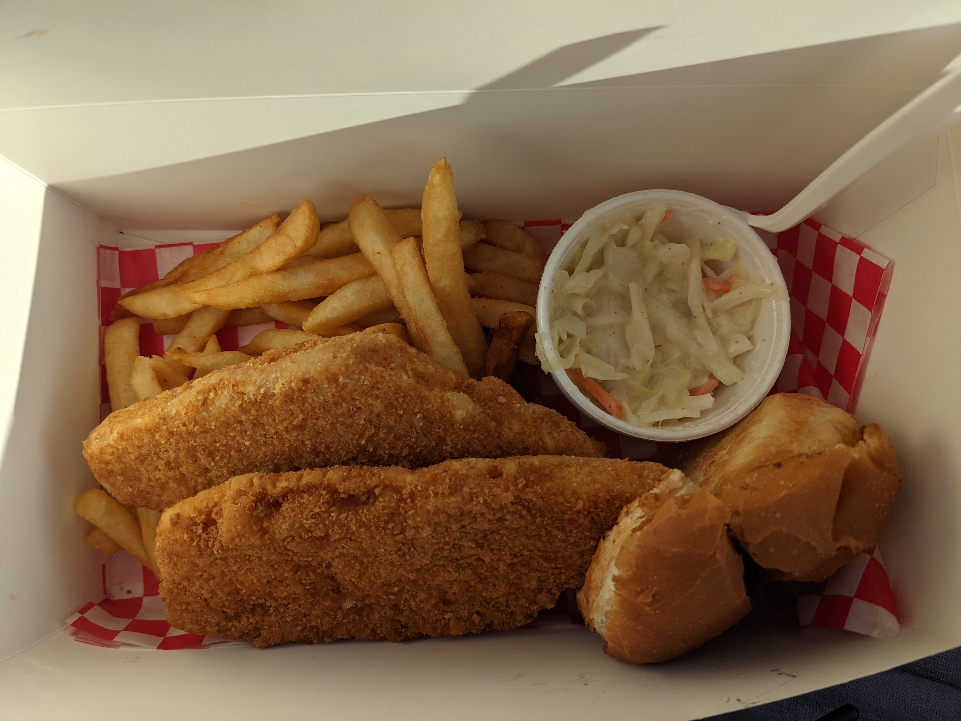 We also got the shrimp dinner and the fish dinners. Each "dinner" comes with fries, a buttered burger bun, and coleslaw or applesauce. The shrimps are absolutely delicious! Panko breaded and tasty with cocktail sauce. The fish dinner was okay. They seem to use the same filets they do for their sandwiches except you get 2 filets. The breading was just a but thicker than I would like but this isn't a fish and chips spot where the breading is thin and crispy so for what they have it was decent. I would prefer eating it as a sandwich though.