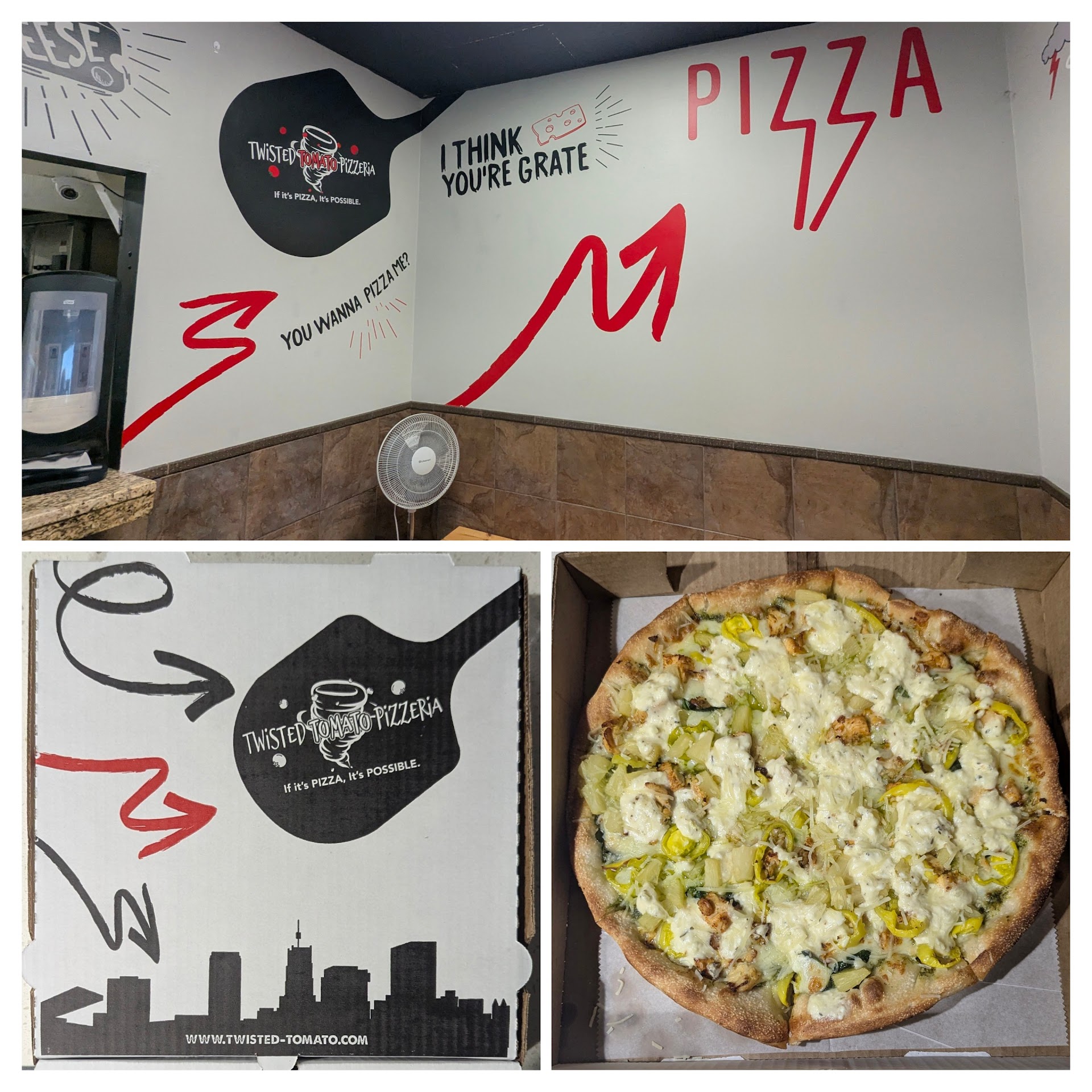 Ordered their speciality 'pesto pizza' online, at Stow outlet and requested an off menu, add-on, topping. The intention was to have a bite piping hot, on the spot! Located at the edge of Crossroads at Fish Creek Shopping Center, the place is takeout only. Dine-in if you count a small bench, like one pinched from bleachers. Instantly, the order defaulted to take out. It was amusing that the playful message, at entrance, did have a purpose. The door spring seems to have been installed the other way round, jack-in-a-box style. Well, banter aside, what's on the wall is on the box (pic). The pesto thing was a proposition of a pizza! This place needs to be explored more, oftener. The pizza was halfway down the deep-dish route. Loaded and sinful. Every ingredient came through - pesto, spinach, roasted garlic, Alfredo and cheeses. And, of course, the add-on topping! Turned out, it was too much for two to demolish in a single sitting - even after the body-mind bickering. The reheated stuff was as good. Purists should be prepared for a 'twist'. Their branding and logo says it...