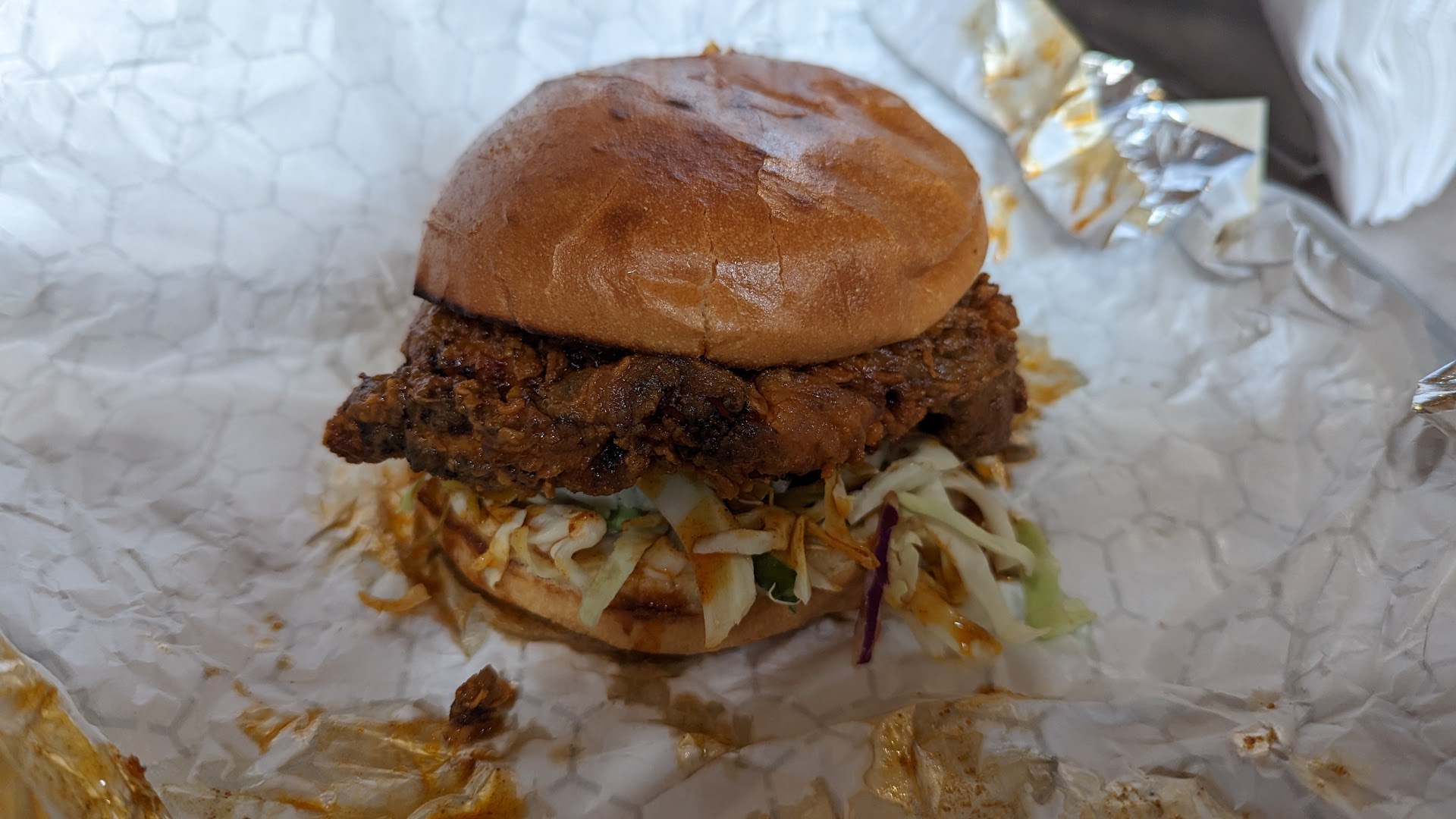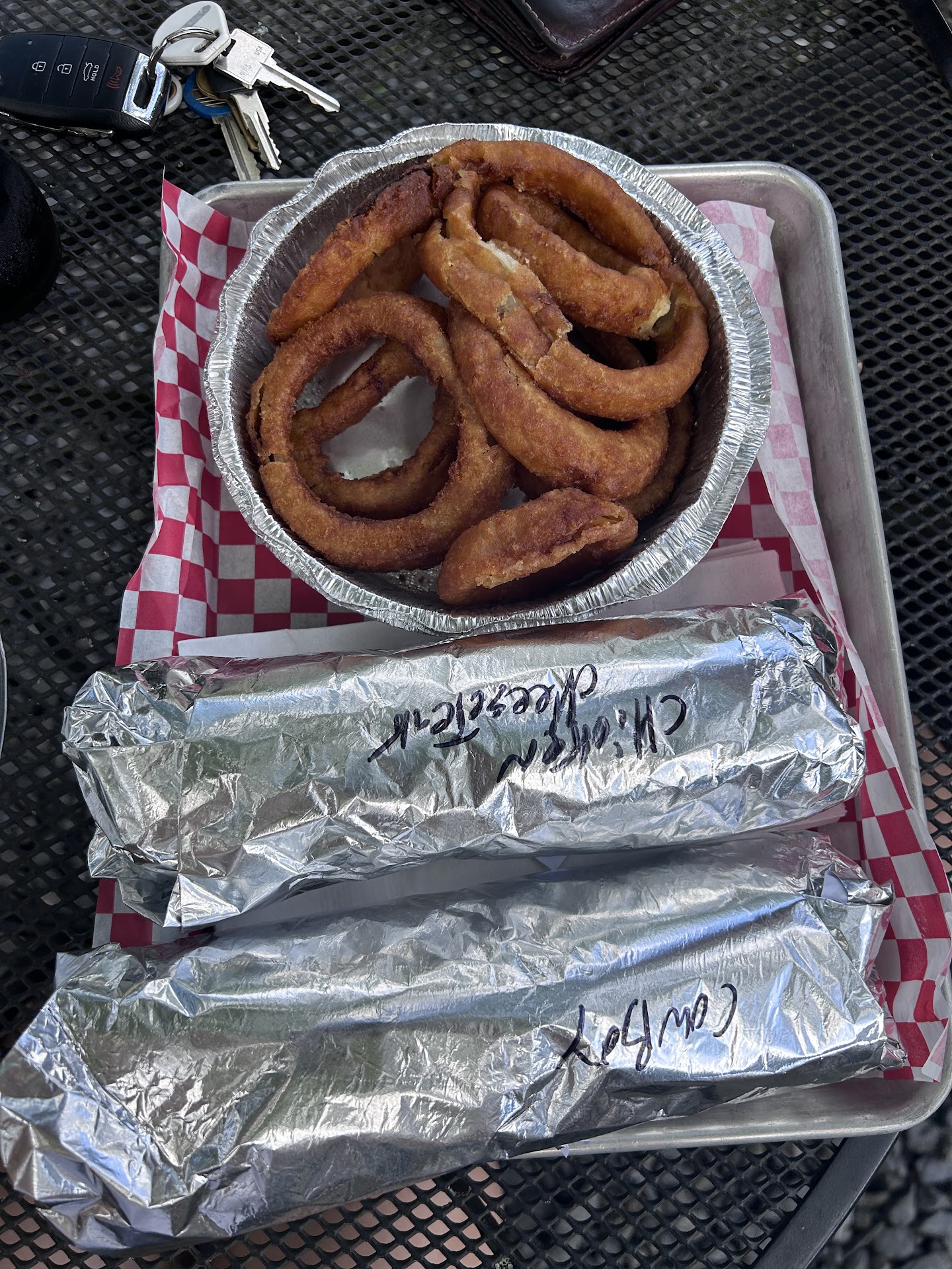 We chose 2 sandwiches for takeout - the Thanksgiving and the Cowboy, plus an order of onion rings. We used the app to order ahead 30 minutes for a 1:00 pm pickup ... it's a Saturday at prime lunch time, so having to wait another 8 minutes or so after our specified time did not seem that bad for the quality we got, and we def were not the only ones eating there today! First the onion rings - these were the best we've had in ages, still hot & crispy even after about 20 minutes cooling off during the drive back to the house. Large sharable portion too. Both sandwiches were very large and we really should have just gotten one to split, which is what we'd do next time. Both are served on a toasted sub roll, and stuffed to the brim. We felt the Cowboy (tender brisket, crunchy fried onions, melted cheese and BBQ sauce) was hands down the better of the two and an instant favorite. The 365 Thanksgiving (Turkey, stuffing, cranberry mayo) was quite good as well, but we just felt in the end that having a large bread roll with a lot of bread stuffing as well was over the top. Probably would have liked this week's special, the Thanksgiving without the stuffing and as a panini, better. Many were eating in - the tables in the dining room (unless people moved them) were fairly well spaced, and it looks homier now than it did when it was the Blue Donkey. We've got a new lunchtime favorite for our list - and may be back to try breakfast as well one...
