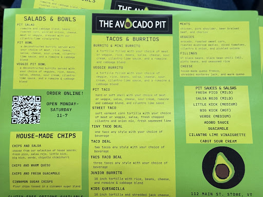 Tucked inside Stowe’s buzzing Brass Lantern building, The Avocado Pit is a bright burst of flavor and good energy. If you’re craving tacos, burrito bowls, or guac so good you’ll be scraping the container, this is your spot.