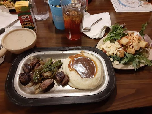 While I have tried many times I am just not a fan of their steaks. Especially for the price is there. There are many better places to order steak. We ended up here because my wife likes it and we compromise often to suit each other. So, I ordered the fried white fish with onion rings and also got the salad bar. The Whitefish and onion rings came out hot. Both were a little bit on the greasy side for my tastes, and the onion rings were pretty much flavorless because of the Abundant batter on the tiny slivers of onions.