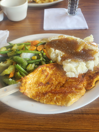 Food: Ordered Biscuits and gravy, waffle, scrambled eggs and sausage. Biscuits and gravy were fluffy and had a great texture. But they tasted like flour. Very little seasonings and lacked the comfy home cooking taste. Probably from a package mix. Waffle was the best item served. Unfortunately it was smeared in a huge glob of margarine? (Or another butter alternative?) It was not real butter, that's for sure. I had to scrape that off. Syrup was generic. Eggs were fine except they were served with cheese. This wasn't listed on the menu and we didn't order cheese, so not sure why it was served. My husband is DF and couldn't eat them. Fortunately, I can eat cheese and was fine finishing them. The sausages were clearly frozen. They had very little seasoning and were extremely thin. They were fried to get a crispy skin/good coloring. I found them extremely difficult to chew, almost cardboard-like.