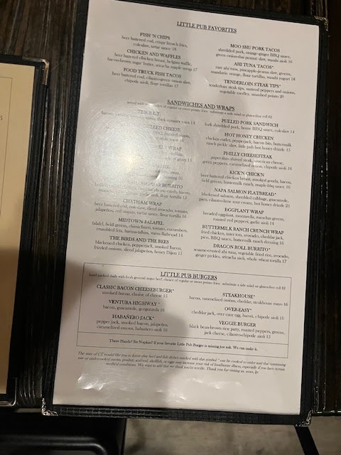 Little Pub Stratford CT was a big disappointment during the visit of Oct 10, 2020. This was my first visit to this location having been to the Fairfield location prior. The venue is different being they took over the former Marnickās, so it is on the beach. Not sure about this but across the street was an empty lot that Little Pub put in a few picnic tables and a band that isnāt ready for prime time. Where is it written that anyone with a musical instrument can also sing. I enjoyed the time the band took a break. Letās get to the overall dining experience. We dined outside. If we had known that they hadnāt made any provision to see what you were eating, inside would have been better. No additional lighting. No additional cleaning of the tables in between parties. We witnessed a wet rag being used on the tables without any sort of spray bottle to introduce a fresh cleaner. The menu was the usual greasy vinyl covered versus many other places using a QR Coded or disposable paper menu. Wait service was lackluster. Maybe it was an off night but in the restaurant business, the first impression is everything from service to food to attentiveness. Maybe Iām wrong, but I donāt think so. After being seated, it was a good 10 to 15 minutes before anyone came over to take our beverage/meal order. The food came out after 30 minutes before the beverages. We had to ask the food server about the beverages. The food server did not reply and walked away. After we spotted the waitress, we asked her about the beverages. Another 10 minutes and the beverages arrived. The chopped hamburger salad was not as the menu represented. The full-size fries on the menu were tiny chopped pieces in the salad. The lobster mac and cheese also had a different presentation versus to menu. No panko breadcrumbs and the lobster was simply thrown on top of the mac and cheese. The cheese was runny. That was a huge disappointment being that we had it in Fairfield several times. The meatloaf grill cheese was tasty, and all ingredients were present however, the onions and bacon seemed to be fused together in a solid form creating a challenge to bite and not create a mess. We also noticed other patrons having a less than stellar experience. Two females at the next table were ready to leave and asked for take-home boxes having to wait about 10 minutes. To add insult to injury, the to-go beverages were incorrect adding additional time to the already spoiled evening. After we asked for the check, it arrived after 10 minutes. Ready to pay, our waitress was also handling tables inside besides the ten tables outside, hence we were compelled to have the hostess take payment as we exited. We hope this is not symptomatic of the regular experience at this Little Pub location, but I am not at this juncture willing to give it...