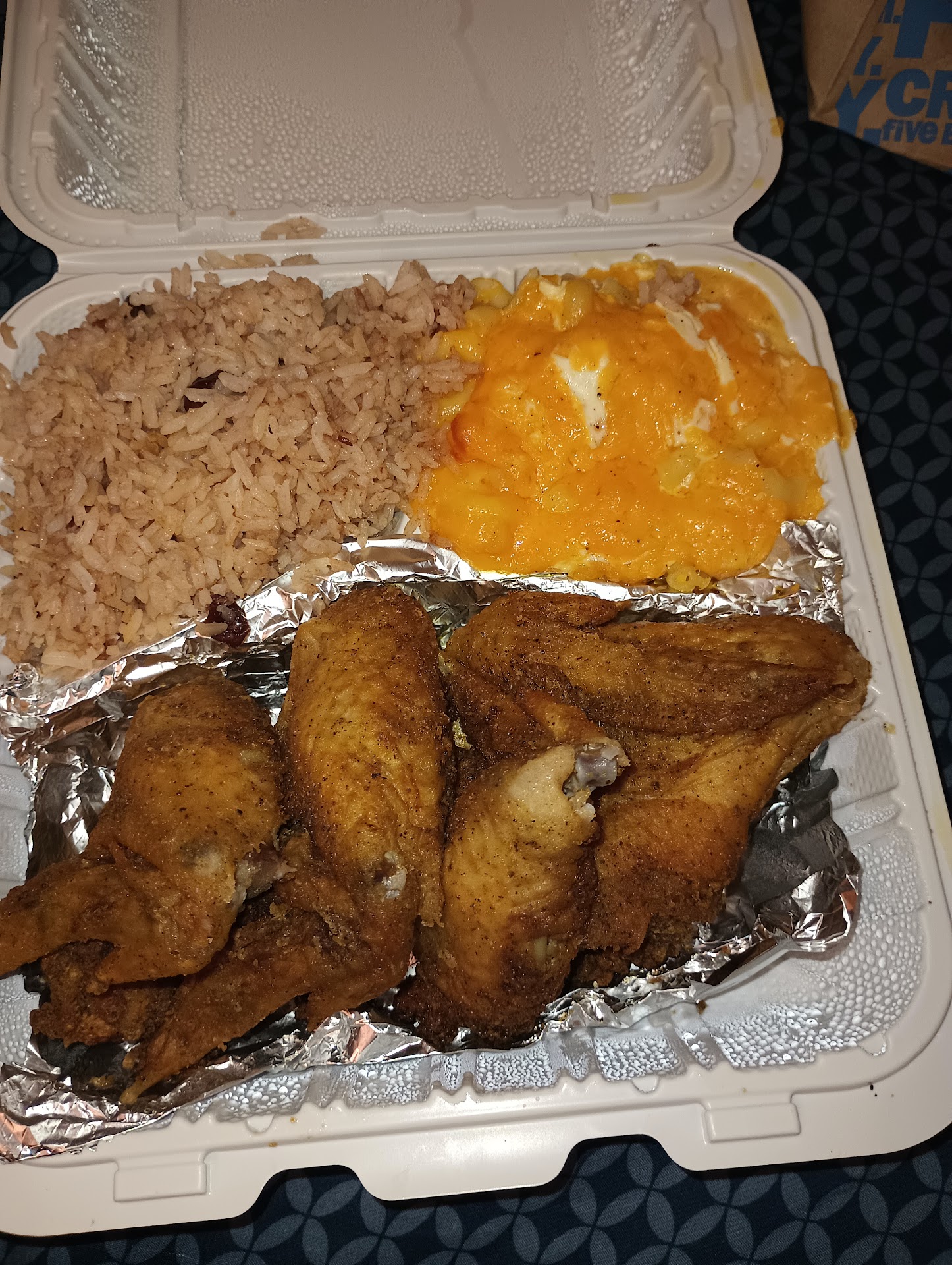 I ordered Jerk chicken, rice and beans and yams; he, Curry goat, mac and cheese and macaroni salad.