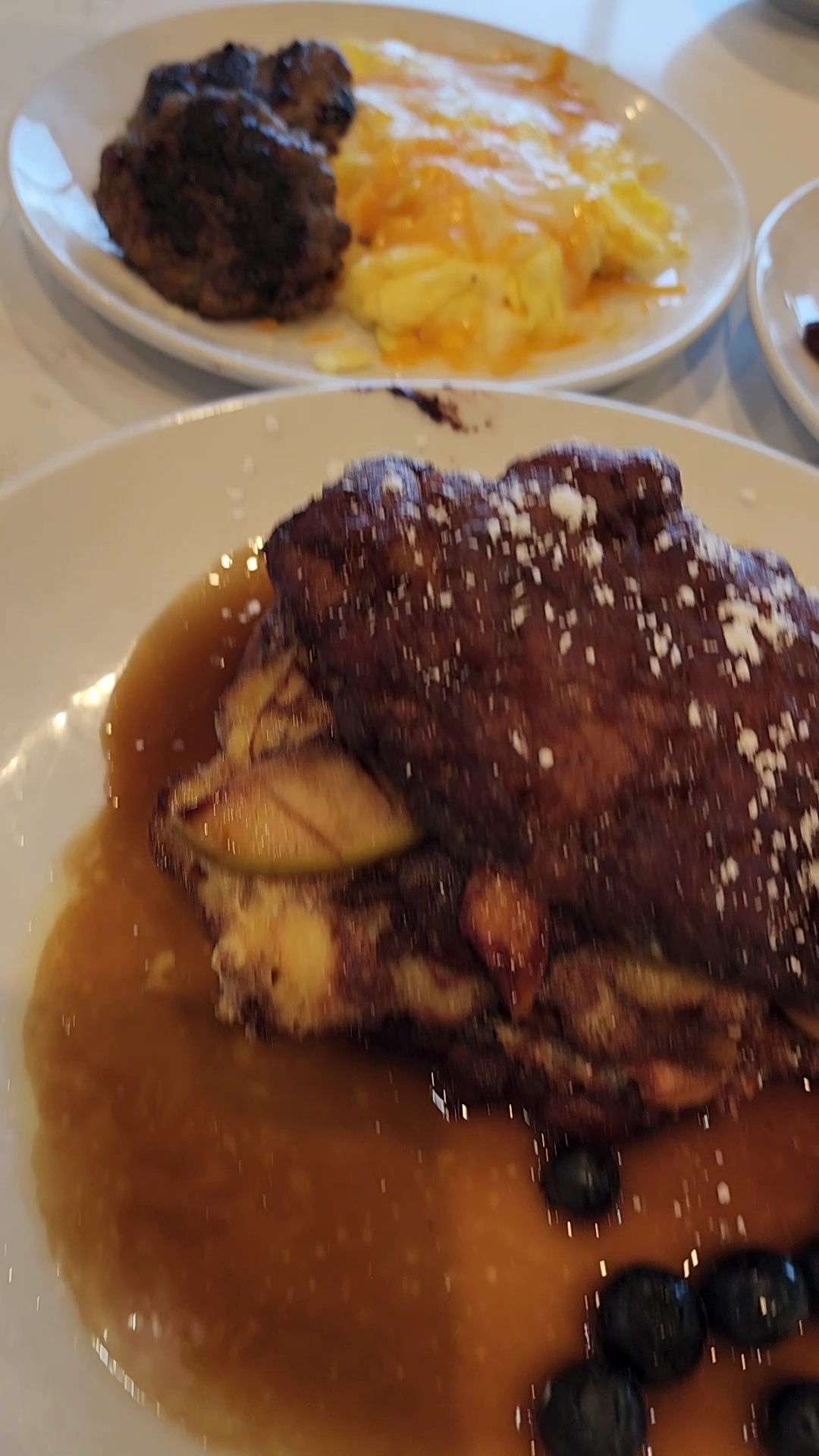 3rd cinnamon roll french toast, cinnamon rolls squished down so much they were basically hard flat discs. Tasted good but unpleasant texture