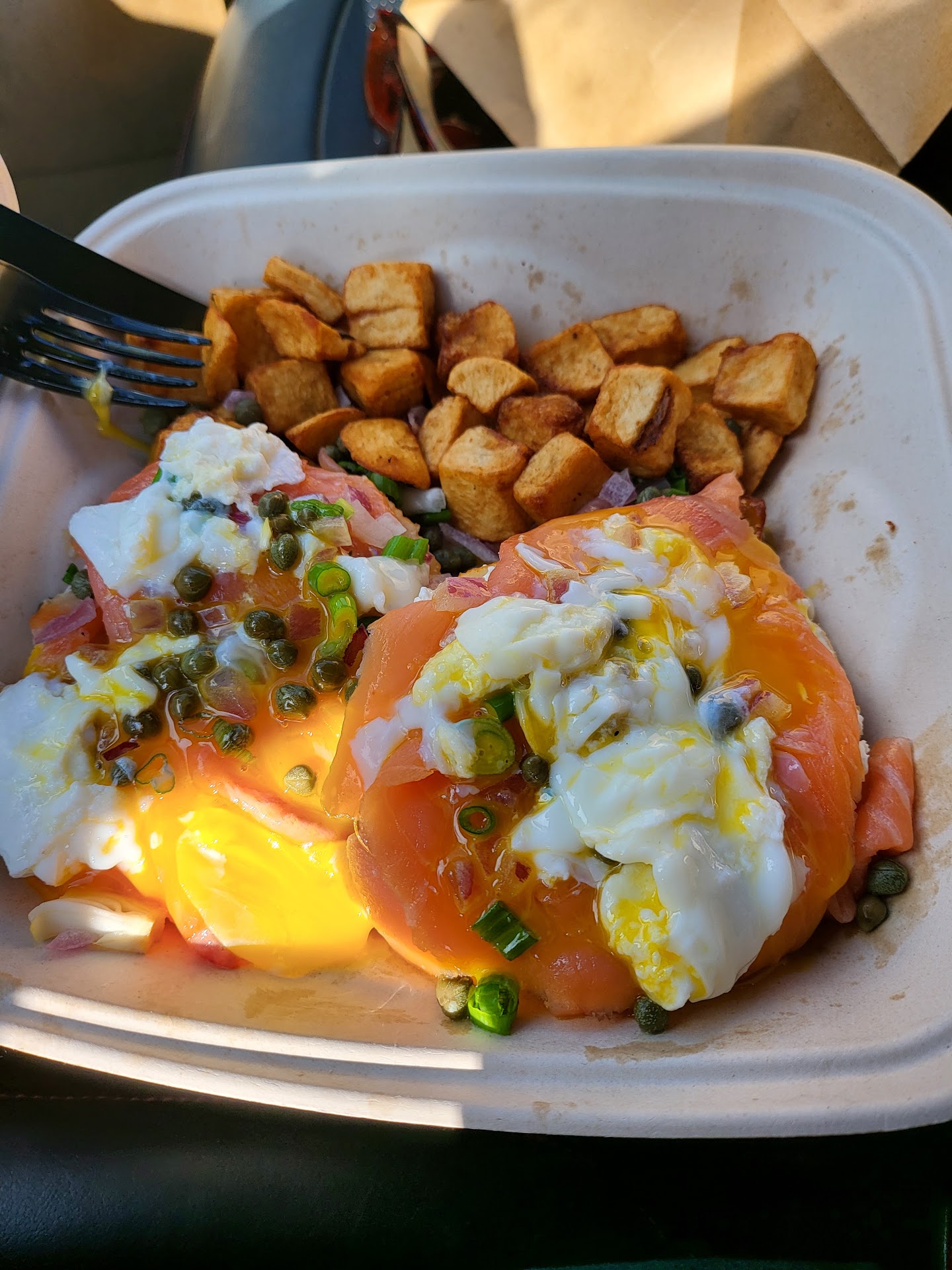 UGH!! Another SEVERELY understaffed restaurant. So understaffed that patrons have to wait outside or in the front while more than half the restaurant booths remain empty. That's right. Only a small section on the dining room and the bar area was actually being utilized due to lack of wait staff while patrons waited 45 minutes or longer to be seated. This was during the week at 11 am. And there was only 1 cook. I found this information unbelievable as this is an egg and waffle establishment that a 5th grade home economics class could execute. And where was the owner??? The manager?? If your staff is overwhelmed in-house then for God sake! shutdown the pickup service and the to-go orders. Pick a lane for your business and employees because those wait staff are not making tip money off those DoorDash orders!!! We waited so long for our simple fair to come, 2 hours from the time we put our name on the list until the time we bolted out the door, that we ended taking our food to go due to another pressing engagement. About the food- I got the Salmon Benedict. I don't like cold eggs in a to go cup, so yeah, that was bad. But I plopped them over my salmon on the bagel any way and chowed down while in my car. The bagel was cold but fresh, the eggs were cold, but there was a huge amount of very fresh tasty salmon and for that I was grateful. That was immediately squashed when I took a mouthful of Southern potatoes that was served with my order. GOOD LORD!!! What did I just put into my mouth!? BLAH!! I have not been so stunned by such a bad side since, well, I cannot remember when. I actually felt traumatized. I know this is long and I didn't even tell you about the host. The term postal comes to mind. He seemed pleasant enough. Yet everything he touched, he slammed on the host station. The menus. The silverware box. The menus again and again! Slam, slam, slam!!! I really should have had that Bloody...