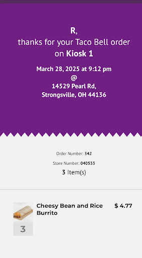 I went to this Taco Bell at about 7:45 pm. There were three cars in the drive-thru, but I needed to wash my hands before eating, so I went inside. I really don't enjoy the "do it yourself" order kiosks (especially after just washing my hands), so I went to the front counter. Two people were working on the cooking line, but I didn't see anyone else in the back.