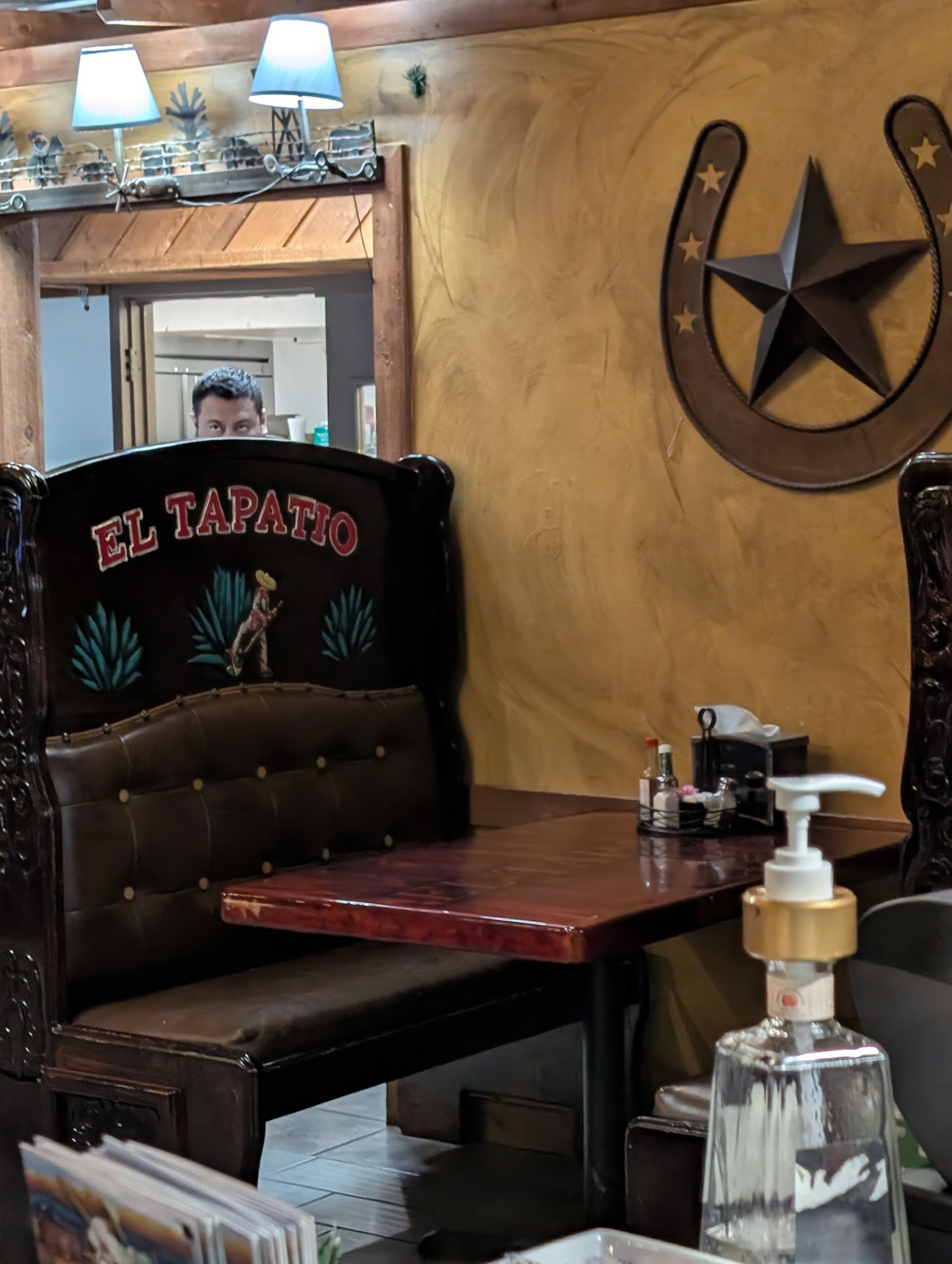 Whether you are headed east or west on the Turner turnpike, here is the Mexican food break you need to take. It is located on the north side of the pike, approximately mid-way at the Stroud exit, in what used to be the Ranch House Restaurant, part of the Cattle Country Lodge. It is easy to access from the turnpike. The interior is large and pleasantly decorated to match the theme “ranch house” and “cattle country.” El Tapatio adds a Mexican spin to the furnishings with the typical carved back chairs. Each chair back painted with bright colorful Mexican scenes and the restaurant’s name, so you will remember where you were in that drunken birthday picture posted on Facebook. And there are a few sombreros hanging on the wall here and there. Overall, a very nice large clean restaurant. El Tapatio is in no way like the small town dumpy Mexican restaurants, that I frequent. The food is excellent, as is the friendly attentive service. Big Menu! Great chips and salsas start the meal. For me the Fajita Jalisco: beef steak strips, chicken and shrimp cooked with onions bell peppers and tomatoes served with Pico de Gallo, guacamole beans and rice. Delicious and fresh with a perfect side of creamy smooth refried beans. My wife had the Burrito Ranchero. A large pork filled flour tortilla, covered in red, green, and queso sauces. Rice and beans on the side. The pork in the burrito was wonderful tender shredded pork. Some of the pieces of pork had a delicious crisp finish; think carnitas. Both meals flavorfully seasoned. Nothing bland. Both of these meals are highly recommended. This was a big surprise for me to find such a quality Mexican restaurant in small town Oklahoma.