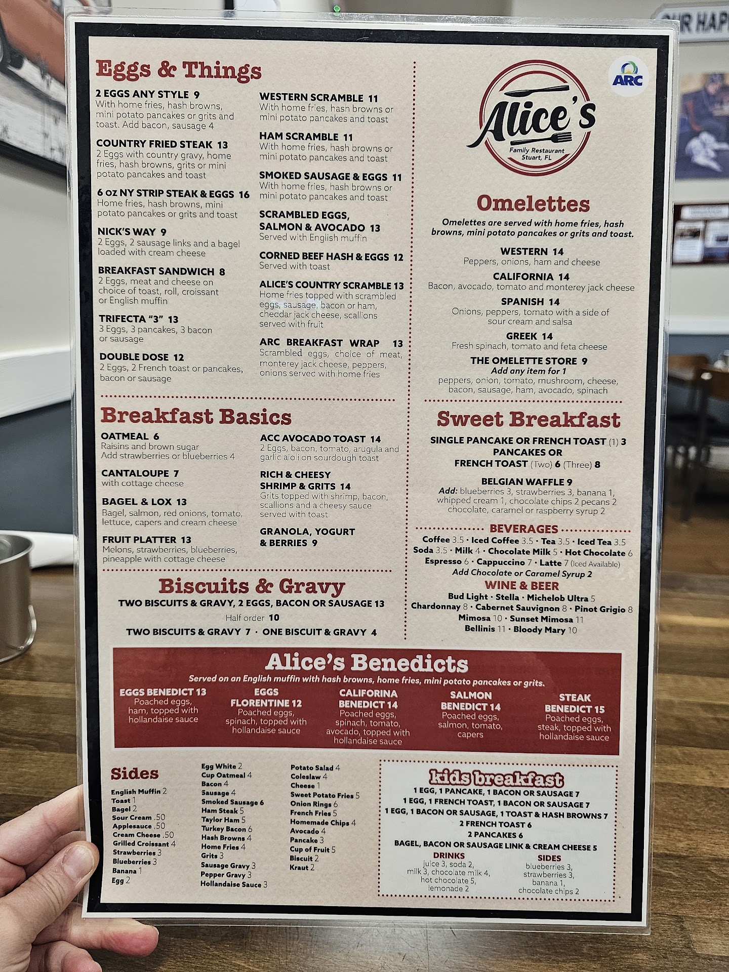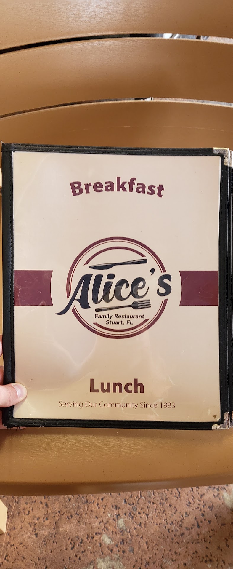 Read moreThis is one of my grandparents favorite breakfast places. While visiting them, during Thanksgiving week, they decided to share with me, the great experience and delicious food that Alice's had to offer. Prior to arriving, they excitedly explained to me that the service there was 2nd to none, and everyone they came into cpntactbthere was super friendly. They were right. We decided to sit on the patio, for breakfast. The patio had fans running, music playing and was a very comfortable environment. While we were enjoying the delicious food, our server was very attentive and made sure my coffee and club soda were topped up, along with my grandfather's decaf. In addition the the great service, though, we also had extremely friendly servers and the owner even came out and greeted us, and we all chatted for a few minutes. I have to say even if the food hadn't been great, the experience provided was so nice, warm and welcoming, it would have been enjoyable. To our benefit, though, the food was also great. I would highly recommend Alice's, if you're in Stuart and looking for either a breakfast or lunch place. They close at 2pm, though, so get...