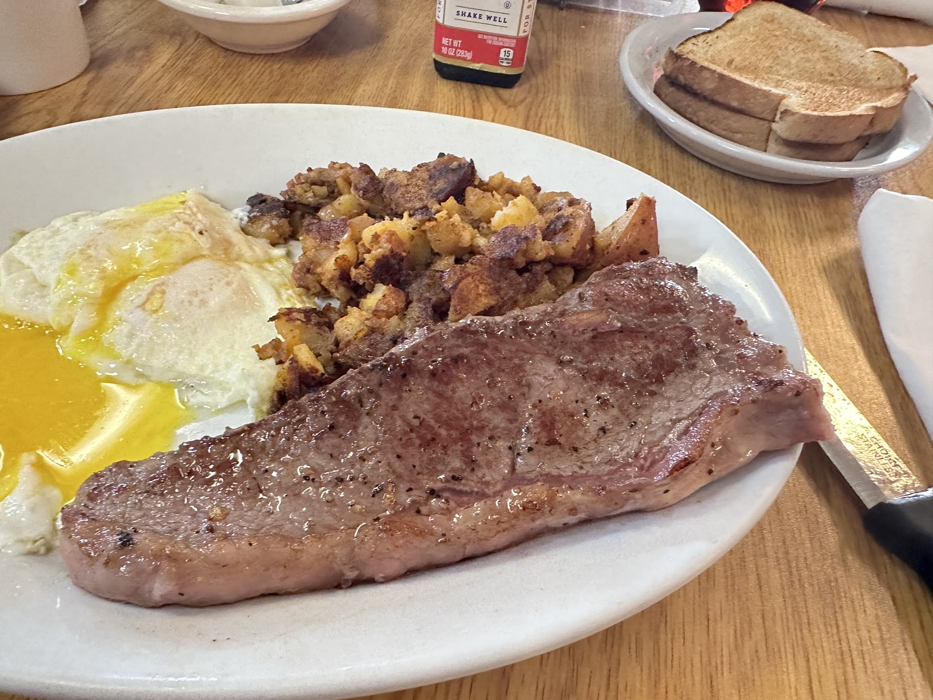 I like road trips because they allow BBDO to expand our reviews to places outside of the Space Coast. This was how I found myself in Stuart, FL, looking for some chow. When I saw the name Alice's Family Restaurant, I immediately thought I was in an Arlo Guthrie song. However, I quickly realized I was still in South Florida as I melted, stepping out of the air-conditioned confines of the Big Boy Mobile. Ashley was my server today, and she was gregarious, professional, and spot-on throughout the meal. I ordered a New York Strip and Eggs with a side of Home Fries and a short stack (2) of Banana Pecan Pancakes. Ashley went to put my order in, so I took a peek around the place. It was clean, bright, and empty!
