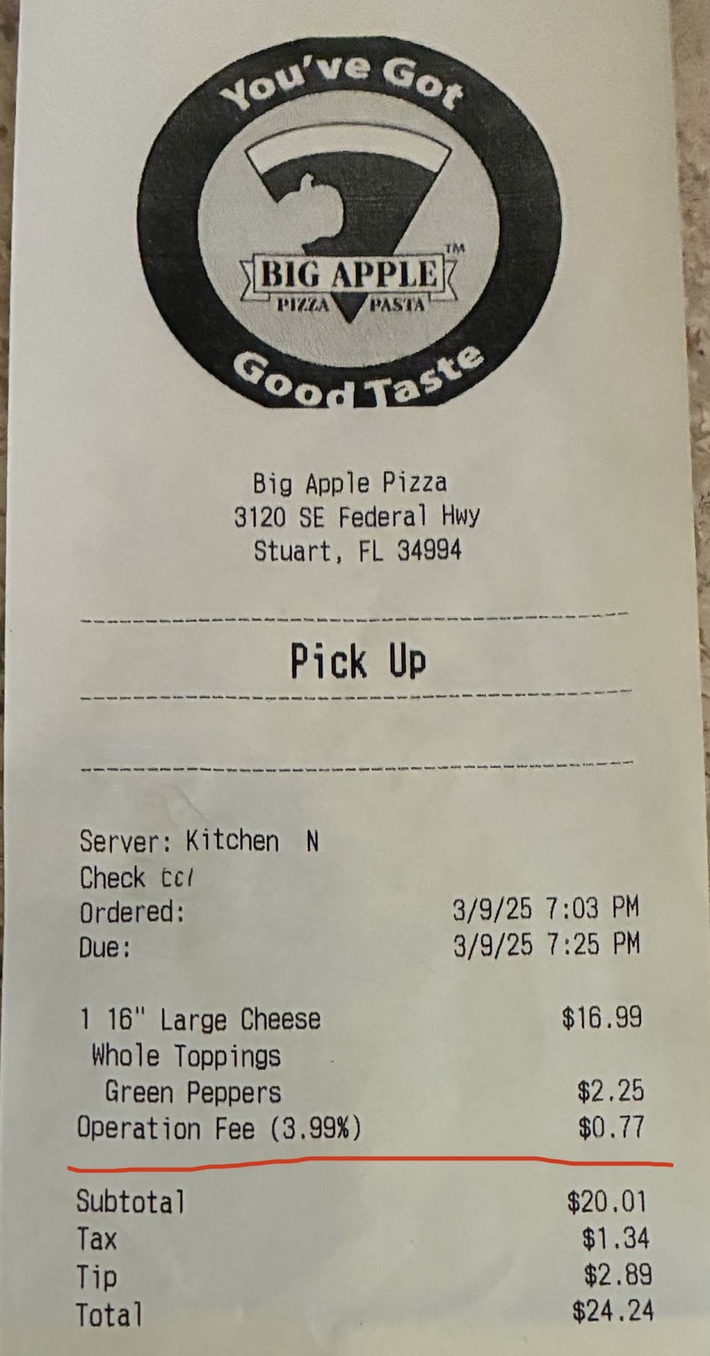 ย ย ย Read more6/25- I have pizza with my mom at least once a week, she is 83 with the onset of dementia. And for some reason she loves Big Apple Pizza and can still remember it is pizza night. Called to get my weekly pizza. Was told 30 minutes, went to pick it up. They could not find my pizza and then the guy making pizza very rudely says "I don't have a ticket for you, you called the wrong store. I said no, I called the Stuart location as I have once a week, for months (at least 6 months). I said to him, that he was the one I spoke to on the phone. He then replies Not me and says show me the number you called and kept repeating that and repeating it in a very nasty tone. When I pulled up the number on the phone to show him, he walked away from me on their phone speaking to a customer. Was told they could make me a pizza, but I would have to wait another 30 minutes. I just left.