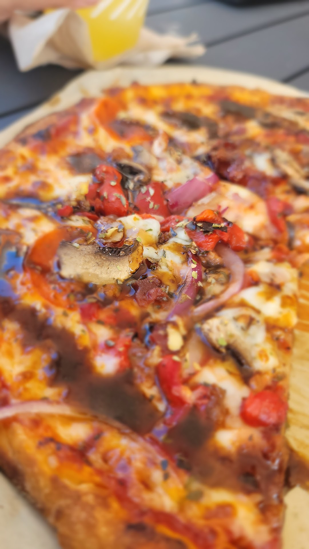 Alright I wanted to give this place another shot as they were great for my wife and kids and I definitely have to tell you the pizza and sauce were great this time so I will be coming back. I had a mix of pepperoni, bacon, onions,red pepper , chopped garlic with balsamic glaze finish if you want to give it a try.