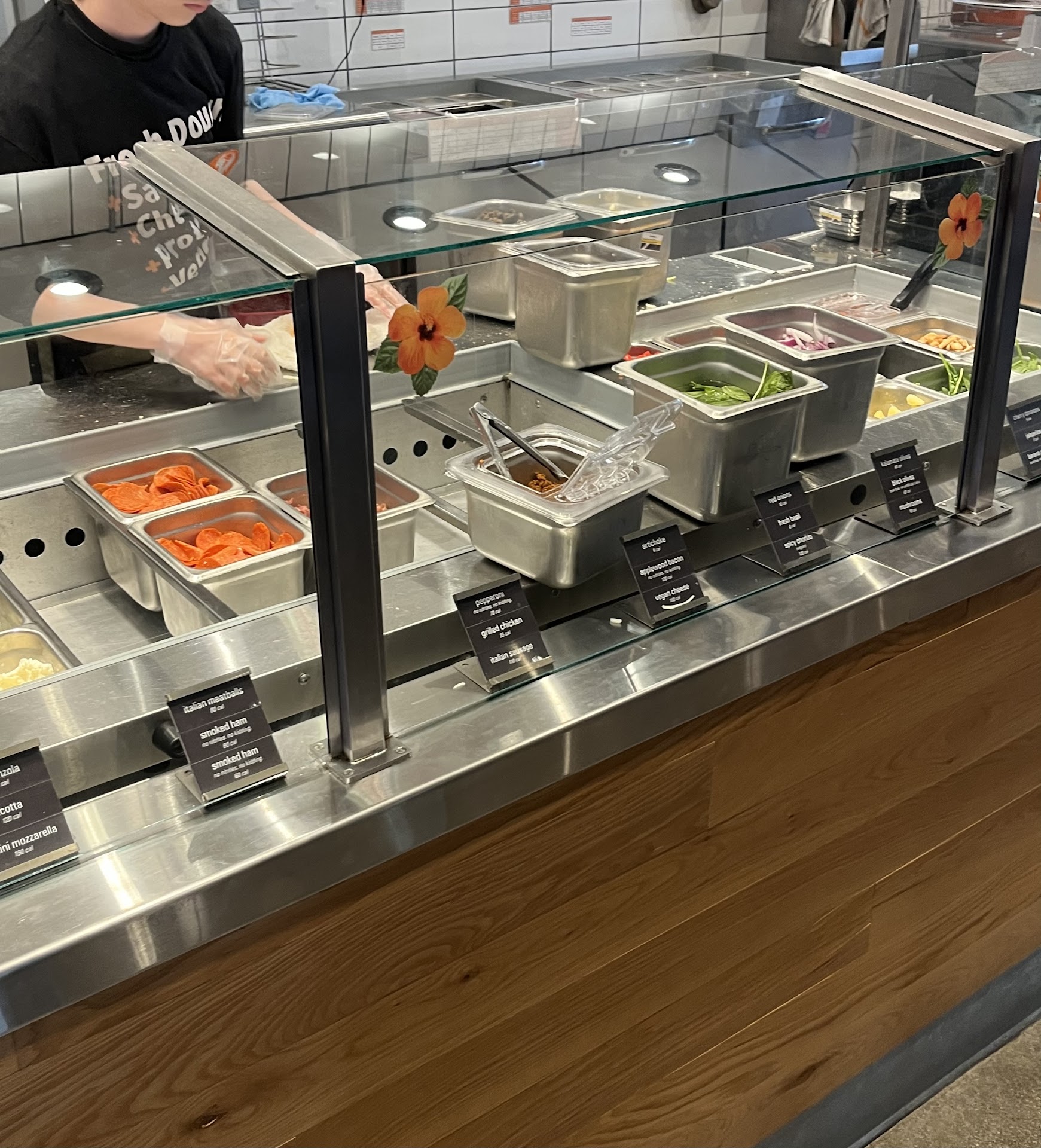 Read moreDefinitely a rough location. I walked in, didn’t get greeted, and waited for at least 10 minutes at the counter before I could even start to make my pizza because they had online orders they were backed up on. I was the only person “in line”… The people behind the counters making the pizza could not have moved any slower to prepare the orders. They didn’t have any dough ready so that added to the wait time and all of their containers were just out on the counter as they made pizzas, which seemed odd and unorganized. Not a single smile or friendly human interaction from anyone at this establishment, except the young gentleman who cut my pizza and handed it to me. He was very polite and efficient. On top of that, the bathrooms were dirty— toilet paper on the floor and no soap to wash hands. First and last time visiting here. You’re better off driving to the one in tradition, even though it’s busier, for...