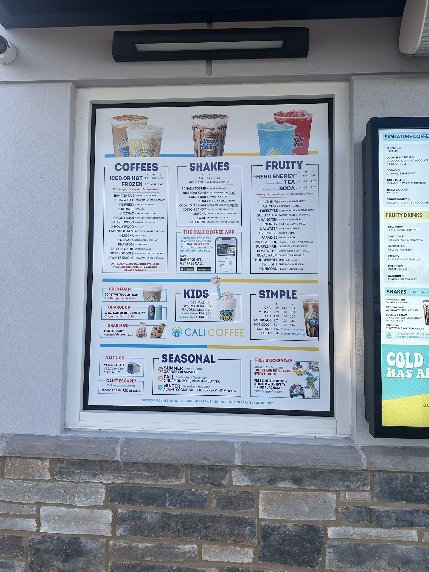 Ā Ā Ā Read moreIāve been watching Cali Coffee get built for the last few months & was very excited to see it open. It definitely lived up to expectations, the service was top notch & the coffee was great too. Although the flavor wasnāt strong, the coffee itself was very smooth & didnāt leave a bitter aftertaste, Thereās lots of to choose from on the menu. Itās not a sit down coffee spot but a drive through & take out window. Very quick & friendly service. They took the time to explain the menu & the origin story of the store to my sister & I. We happily signed up for the loyalty program because we both...