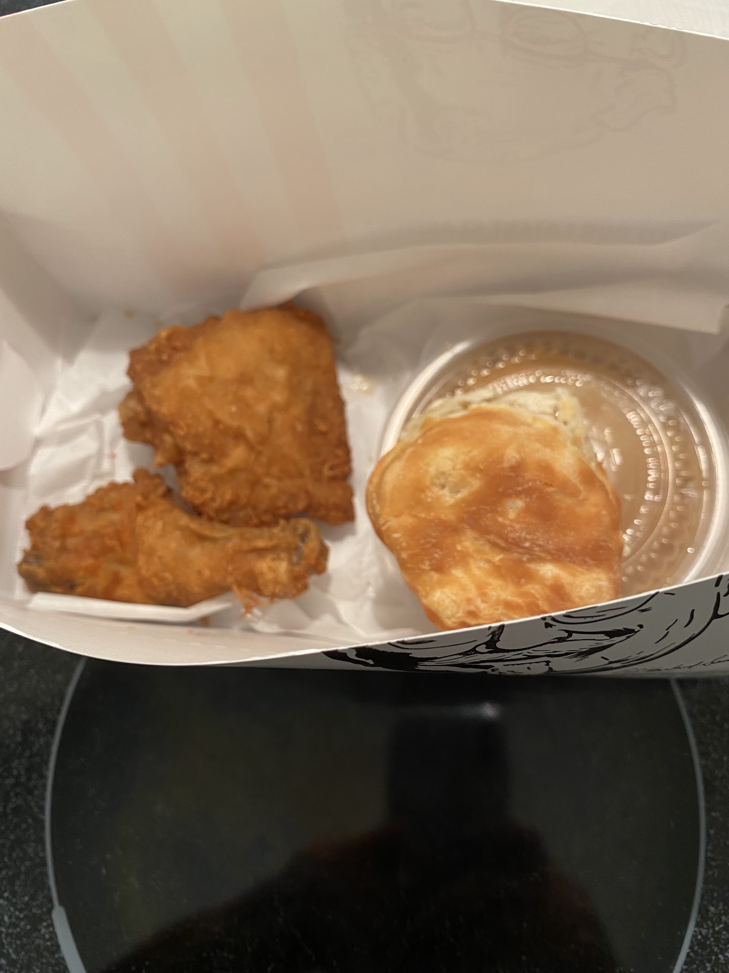 Read moreSecond visit. First visit a month ago 1/2021. Waited in the drive thru for 20 minutes. Finally got to the order box and was that told drive through was down and come inside. Second visit. Dumpster gate blocking off drive thru. Nice. Smart move by employees to keep business slow but bad for customers. Didn’t wait long in line but register went offline as soon as we got to the window. Seems to be a recurring theme. Order 2 piece meal and 3 mashed potato bowls. Bowls had as much mashed potatoes as a single serving. Pretty sure they scooped an individual side size into a big bowl. Charged full price though. Also order 5 drinks. No straws and no receipt. Tried twice to give them a chance. Twice failed. Not going back anymore and would recommend avoiding. Took photos of the bowl but no where to...