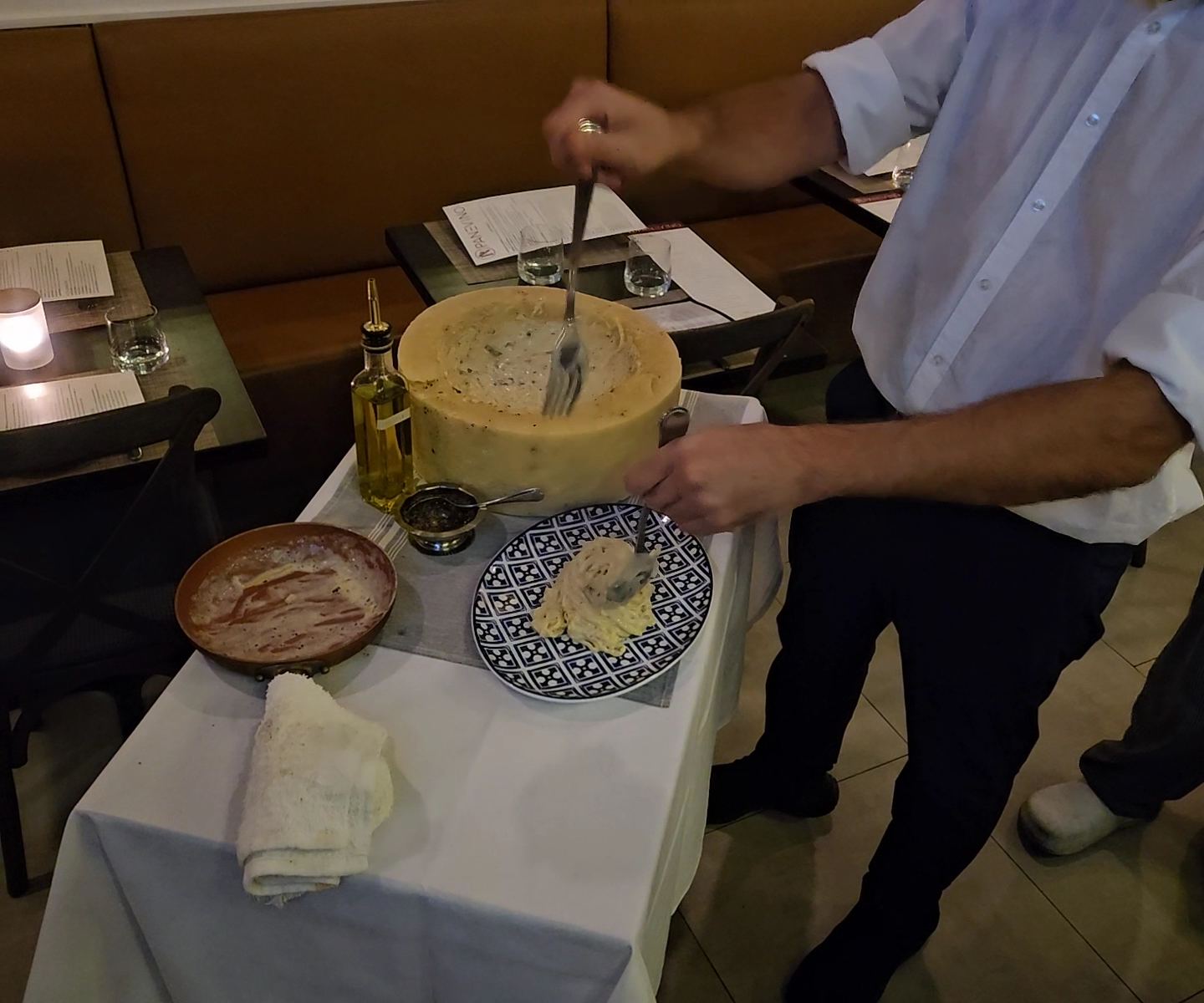 Good day to all you restaurant goers out there. If I may make a brief point before my review of Piatto Divino. I and I'm sure you all are painfully aware that no restaurant sets a goal to give you the worst guest experience. If I may suggest something please. I have yet to write a bad review on a restaurant and dread the day that I do. BUT, When I have a bad experience I do kindly ask for the manager on duty (MOD) and without making a scene I share my dinning experience with them and make a few points with my emotions in check. I have yet to have push back on any of my conversations with the MOD and I tell them it is my intention to come back and retry my dinning experience with them at some point in the future. This has typically gone over well with all my encounters and it has worked every time. My 2nd visit usually goes off without a problem and I have a great experience. I hope this helps and every Restaurateur wants to hear from you good or bad so they can improve. RIGHT? Help them out be reasonable and understanding. NOT confrontational....That will go nowhere fast. I mention this not because I had a bad experience here. I absolutely have not. I was looking at other reviews at other places and that was something that stood out to me and I felt that I needed to say something about giving a restaurant a bad review right off the bat. That is all. OK, On with my review..... I usually have my Rib eye but that was not on the menu here. So I picked a dish that seemed interesting to me. I started with a nice Caesar Salad and then the main course. That was the Rollatini Di Pollo. The Chicken was tender and juicy and the imported Italian Ham gave it a tweak to the chicken flavor. The Asparagus was cooked to just a light crisp crunch when you bit into theme. I also notice my neighbor had an interesting dish as well but I didn't catch the name of it. I had also ordered a glass of Moscato D'asti, Podere di Chiara, Bianco Mio, Piemonte with the meal too. Once I was done with my meal I noticed a couple over in the far corner that had ordered a dish that need to be prepared in a Cheese Wheel. I did not catch the name of the dish. They gave me a taste of it and OMG was it ever creamy with fresh very course black pepper corns ground. It...