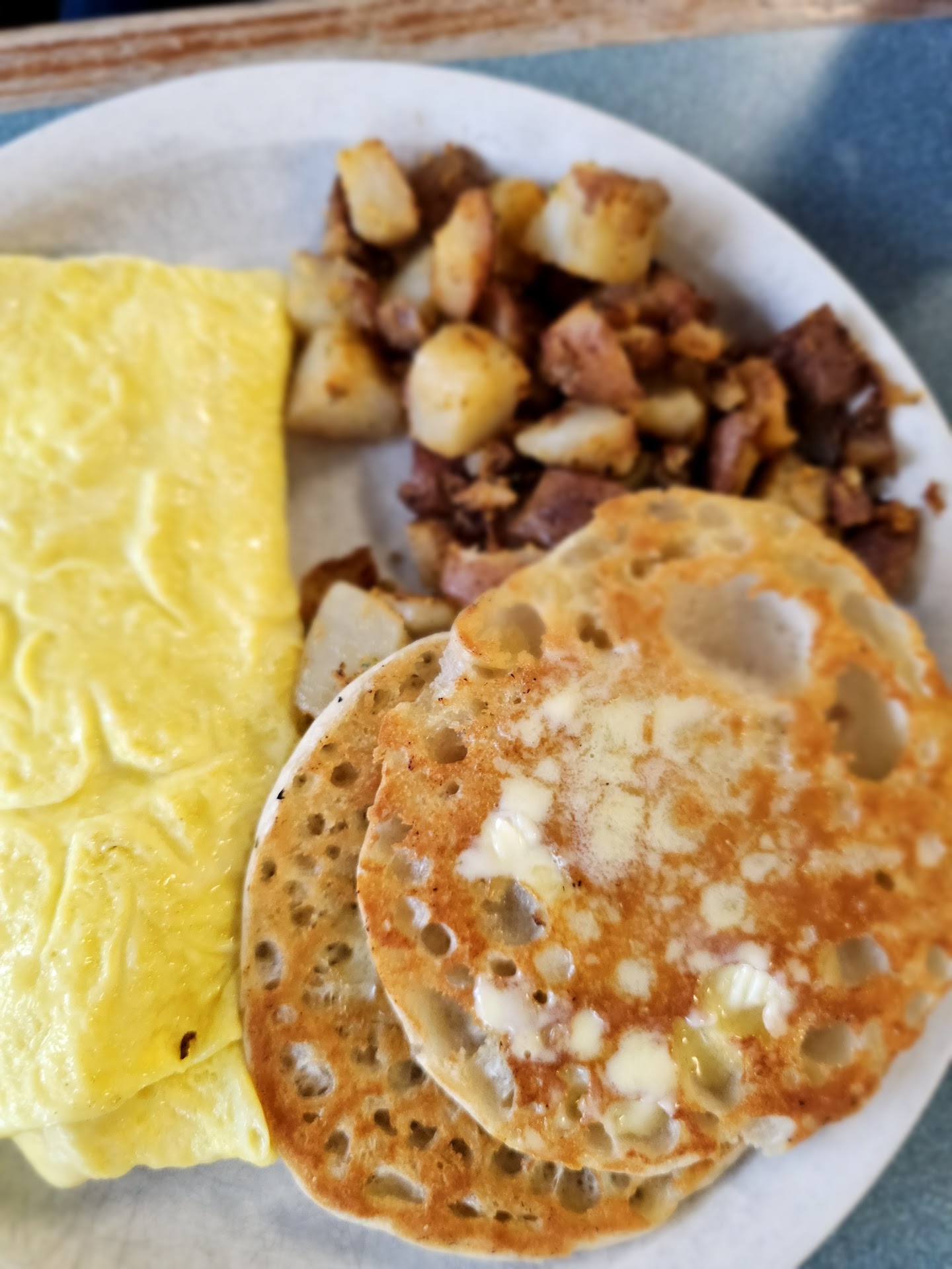 Traditional breakfast items like pancakes, waffles, egg sandwiches, etc. All delicious and quickly served.