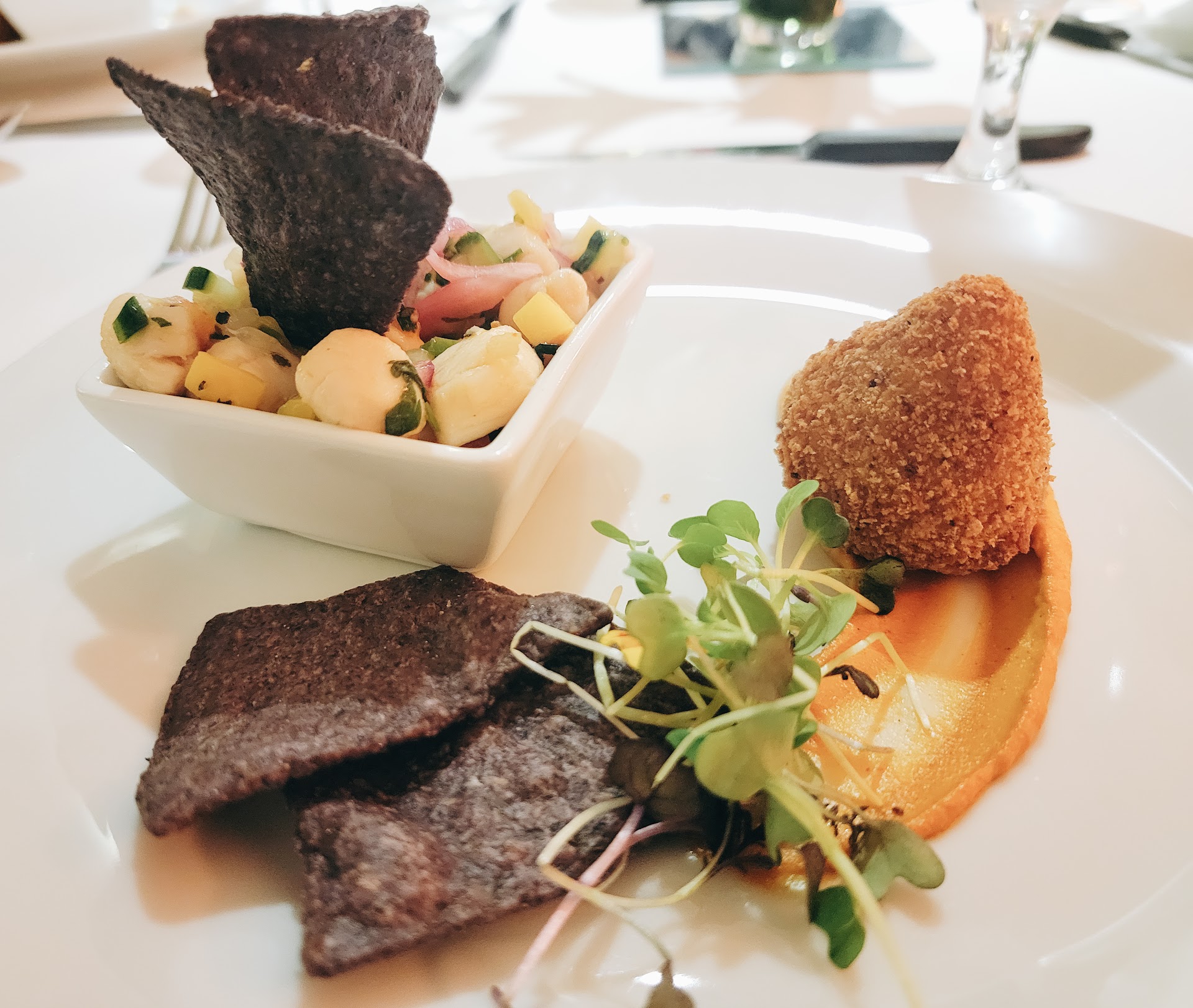 This six-course smorgasbord began with ceviche scallops and a scrumptious little chicken croquette. While the croquette was scrumptious and pulled a nice bit of spice from the sauce smear below, I was quite taken by the luscious little lime pillows of the ceviche.