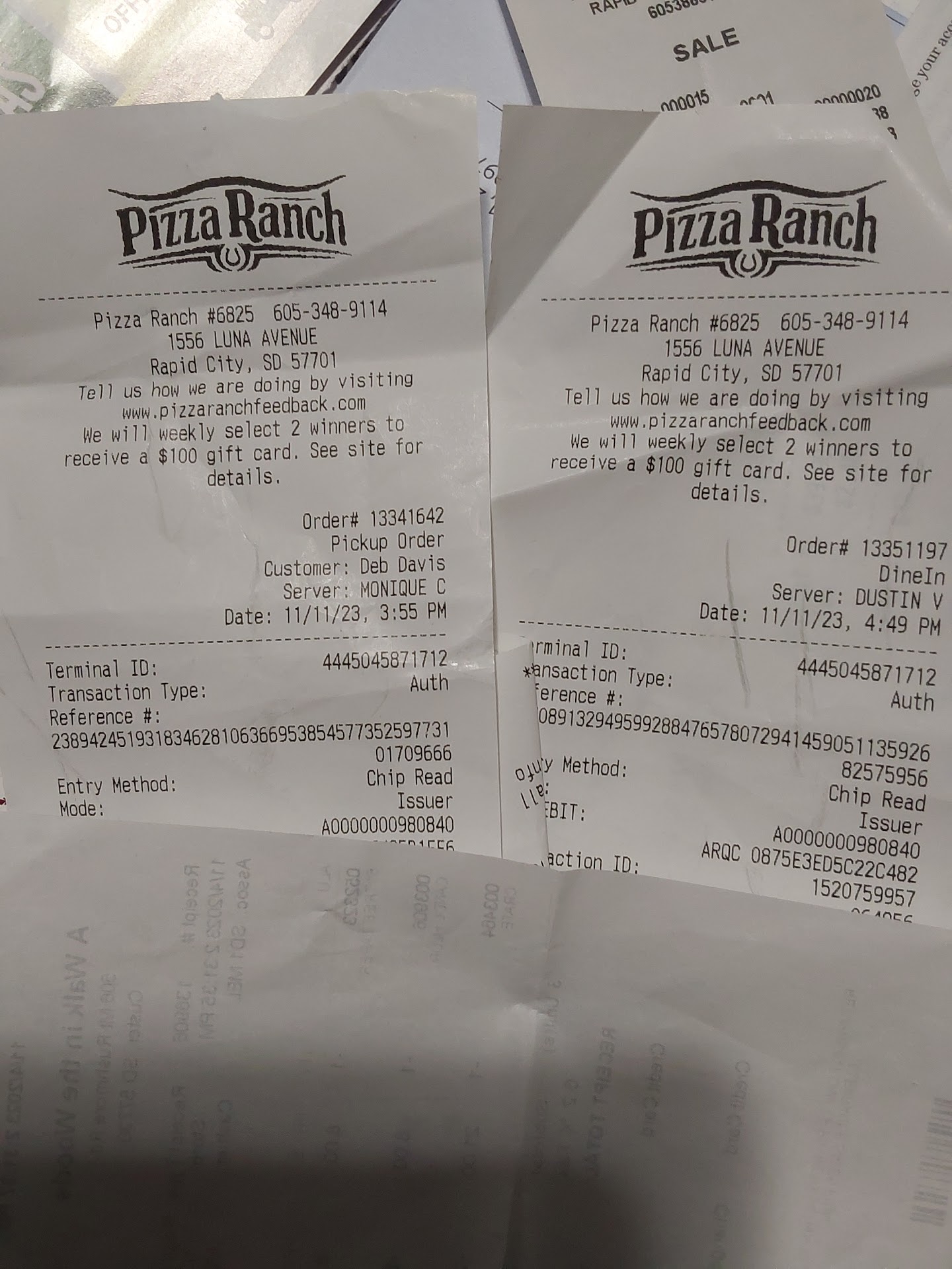 First I find it very sad Pizza Ranch did not respond to my feedback per the web address on my receipt. I ordered at 03:55 on November 11th. I asked Monique what my better deal would be, two eight piece combo or the 12 piece chicken adding chicken and sides. She said the combo, I ordered two of them which included a side and I added a side. She said it would be 10 to 15 minutes because of chicken, and she would bring it out. At 04:45 I went and asked where my order was, assuming it had to be done because new chicken was constantly coming from the kitchen. The two kids who were working had no clue. Because my husband is a Veteran, who could eat free on Veterans day, I was fed up and grabbed a to go box, he could have eaten and be done by the time we got our food. At 04:49 our food comes out as well as a clerk who asked if I paid for the to go box. I advised he was a veteran and he eats free. I guess not from to go boxes because I again was charge Take Two for $10.00, later I thought I should have gotten another to go box, because I paid for it. We get to the pickup and I check the order, wrong, not the combos I ordered. I went back in to tell them we didn't get the correct order. Finally Monique shows up and sternly said "you ordered a 16 piece chicken." I decided my time arguing with her was useless and time consuming, people were waiting on us. Five miles later dinner is served, with cold chicken. Customer service and quality control at it's worse at a...