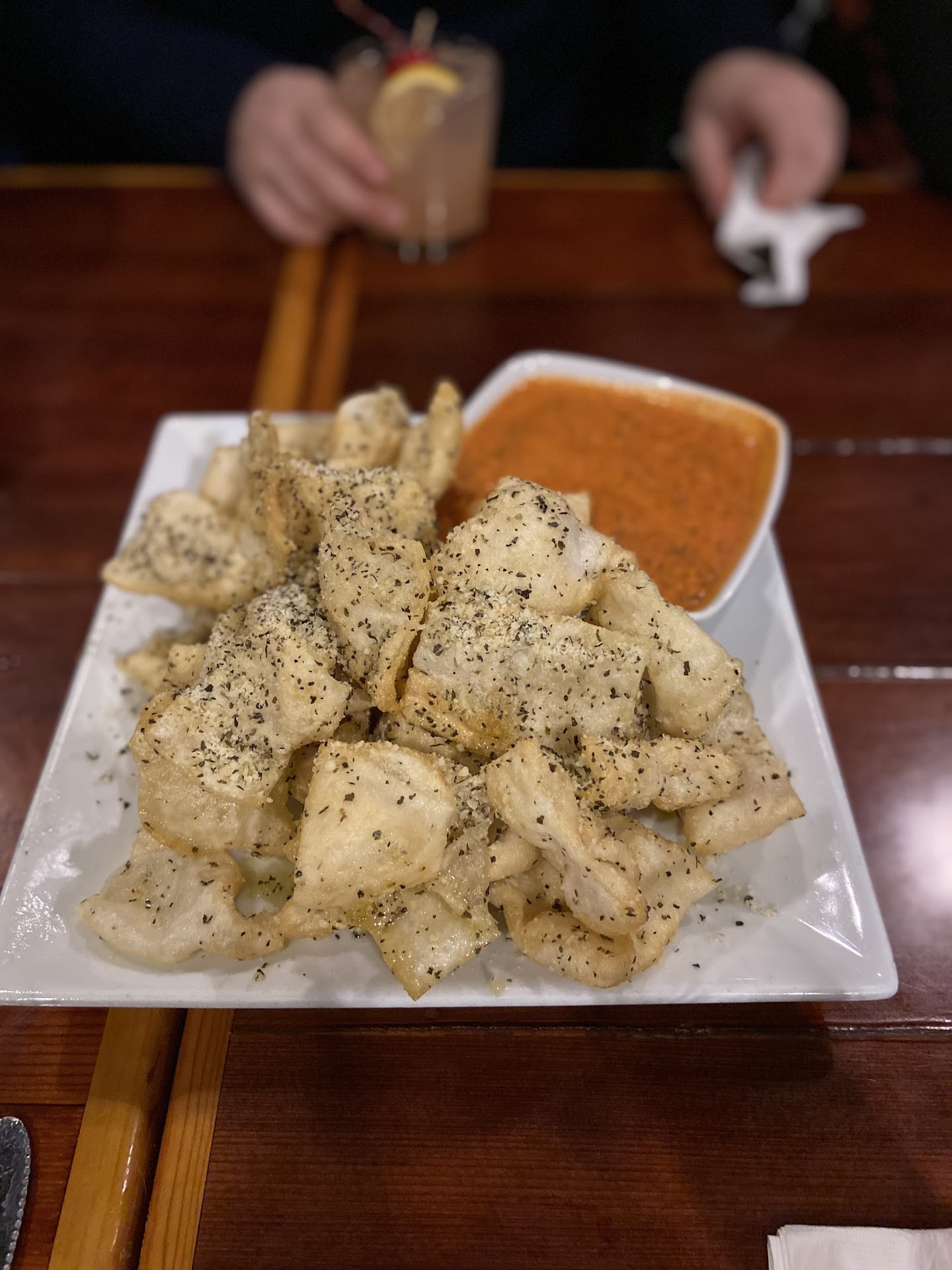 There was a bit of a wait on a Saturday night for dinner. We both got drinks from the bar while we waited. The drink menu is inventive. The drinks were delicious. I got a Mango Habanero Margarita and my friend got the Blue Raspberry Mule, both fantastic.