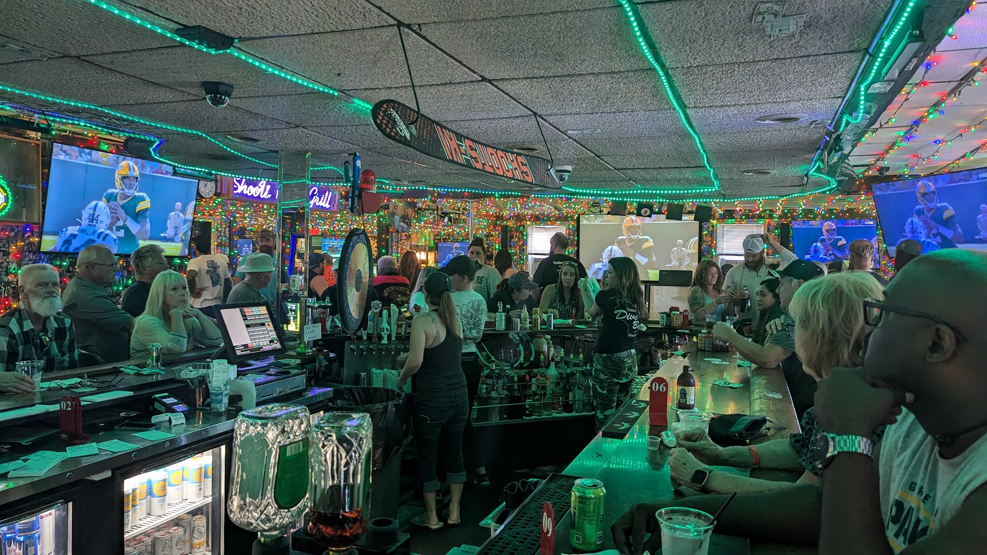 The previous reviews for this bar are so spot on. Suamico is a very small town so it's really one of the only local spots that can cater to all ages. We arrive around 6:45 pm on a Saturday for dinner and drinks as a group of 4. We found one open table and scooped it up. The age of the crowd was probably 35+, very flustered waitress, seemed confused but greeted us promptly, got our drinks and gave us some menus. She returned 25 minutes later to admit she forgot about us, very apologetic, took our order and put it in; no big deal, we had drinks and good company (plus good people watching). Food came out, very accurate and tasty (3 burgers and a small pizza). We never saw a waitstaff person again. After another 30 - 40 minutes we saw our little waitress run by so we flagged her for our check. Now, at this point, we notice the crowd has shifted to mostly 20 - 22 year olds ready to party...party on but time for us to go! We called for our uber back to our airbnb and his exact quote "I've never picked anyone up from Shoots before bar close". Gave us a good laugh and a reminder that we are now approaching 40 and bar close doesn't look good on us!