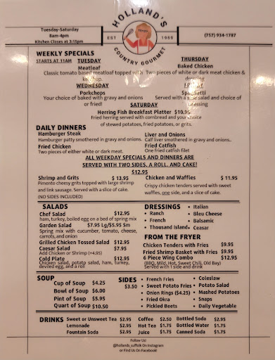 My wife and I are from Texas and were visiting family in Suffolk and just came from the cemetery where my grandparents are buried at. We were looking for a place to eat. From the pictures that we saw of this place we agreed to go and try it. We ordered the burger with coleslaw, the liver and onions with collard greens and a shrimp and fry basket. The Wait Staff was awesome and had wonderful personalities. Lucky for us we were the only people sitting down since we arrived just after 2:00 PM. We were each given a piece of chocolate cake as well. The two Chefs most definitely know how to make liver and onions and collard greens. My wife had tried greens at various restaurants in Texas and just never liked them. She really liked the greens here and the chocolate cake as well. I told the Manager I presume " Kudos to the Chefs". I recommend that if anyone wants some Southern style food along with some true Southern hospitality to eat here. You won't be disappointed at all. We parked in the Public parking lot behind the restaurant. There is wheelchair accessibility here. The Manager informed us that some time before Thanksgiving they're cook for pickup and have calls from several towns in Virginia and North Carolina as well. I have no doubt at...