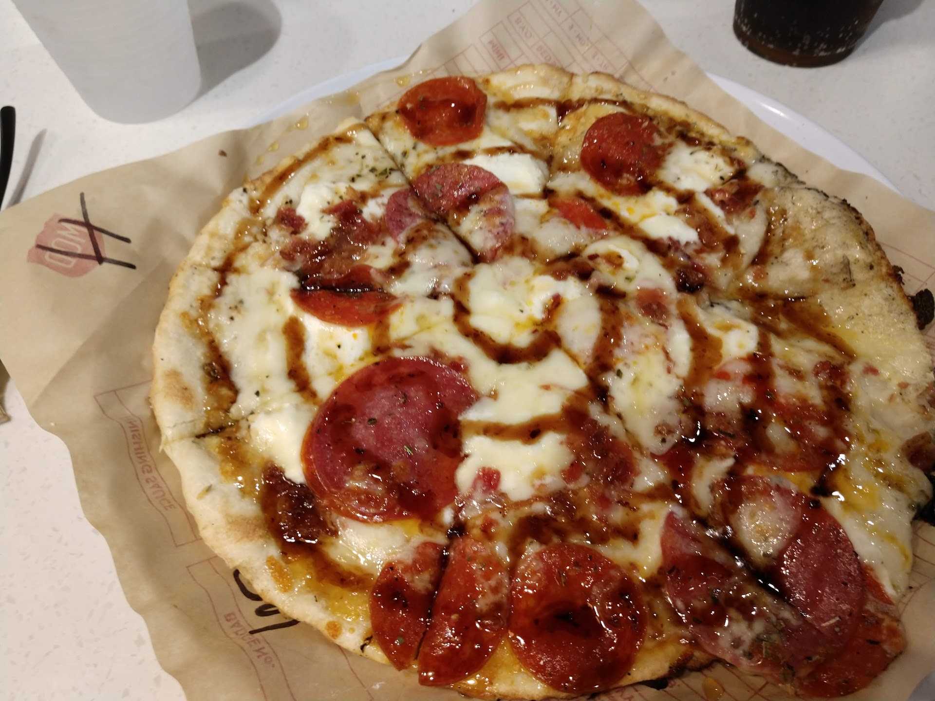 Read moreI've been to this location twice and it's hit or miss with customer service. The concept is great, basically the Moe's of pizza. One flat rate for whatever type and amount of topping you want. I've gone all the meats previously, but this time I went Mod size, white sauce, ricotta, and mozzarella base. Pepperoni, salami, and bacon along with more mozzarella before the pie was put in the brick fire oven. My finishing sauces were the fig balsamic and the hot honey. My wife went with a mod size, white sauce, garlic, mozzarella, ricotta, and feta base. Basil, tomatoes, mushrooms, and chicken finished it off. We had to wait 5 minutes for the white sauce to be restocked before our pizza could be made.