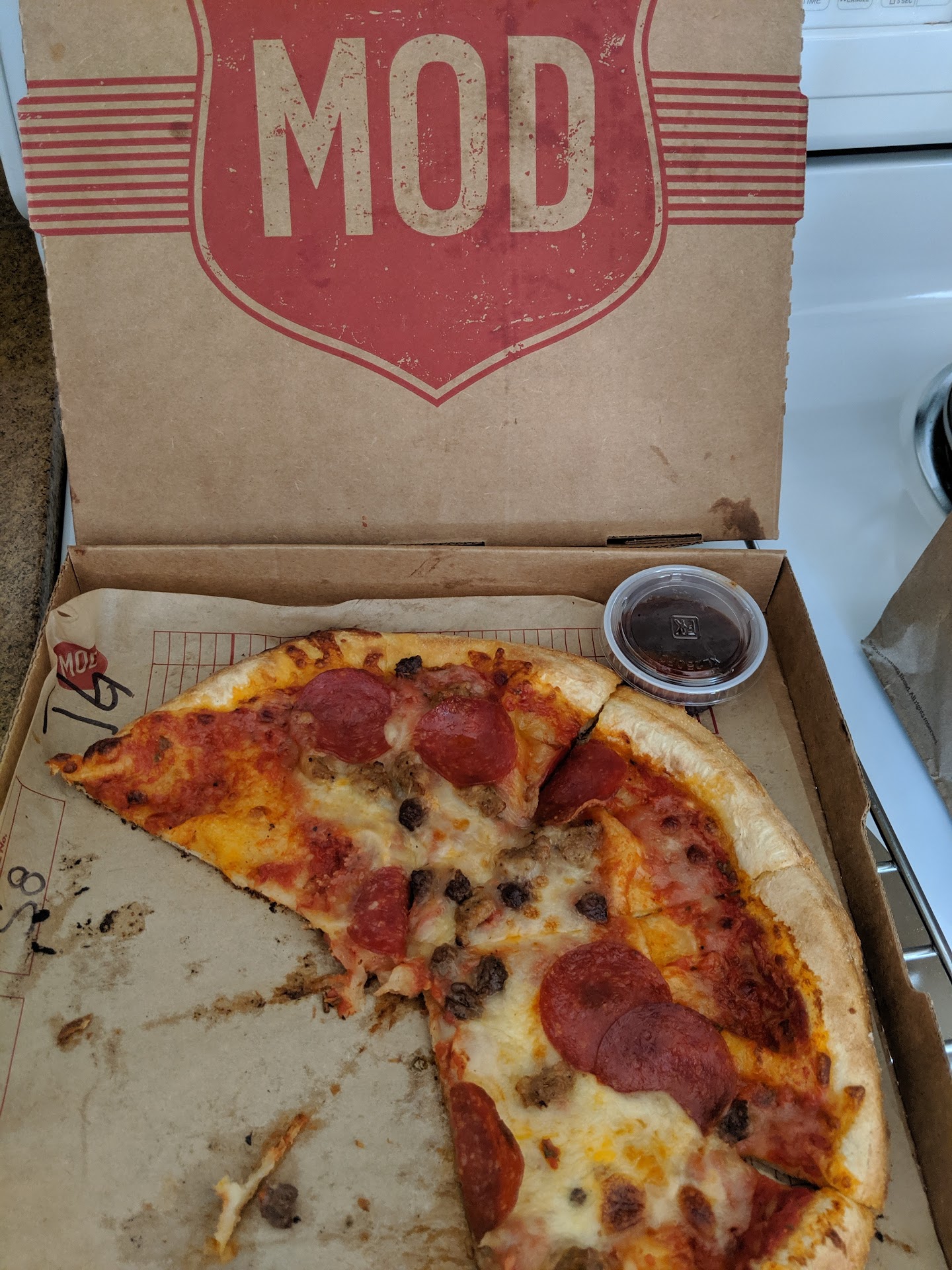 3 strikes and you're out MOD. The 1st strike was a complete disregard for cross contamination. They used the same gloves for every customer and threw the toppings and cheese all over that things we didn't want on our pizza was put on because it was such a mess. Strike 2 was I waited 45 min in line before even getting up to order. The line was not very long but they were extremely slow. Then strike 3 was today. I placed my order through the app in order to make things faster. As soon as we arrived in the restaurant I made it known that we were there and they had our receipt printed. The order was labeled as complete in the app 15 min after placing the order but after waiting 45 min in the restaurant I spoke to the workers and they said half of the order was not even started yet! We waited a full hour in the restaurant and watched many other online orders completed before us even though ours was placed before their's. I asked them, that's how I know. My father in law was not able to eat with us because his lunch time was over. I spoke to the manager and he didn't seem too concerned that it took so long. His excuse was that their computer system was slow. He never offered to compensate us for the wait time (like chick-fil-a would have) and when I said they may be losing customers he wasn't too upset. It's sad because the food is mostly good but this branch needs different management and faster employees. I've been to other MODs and they had none of these problems. It is only...