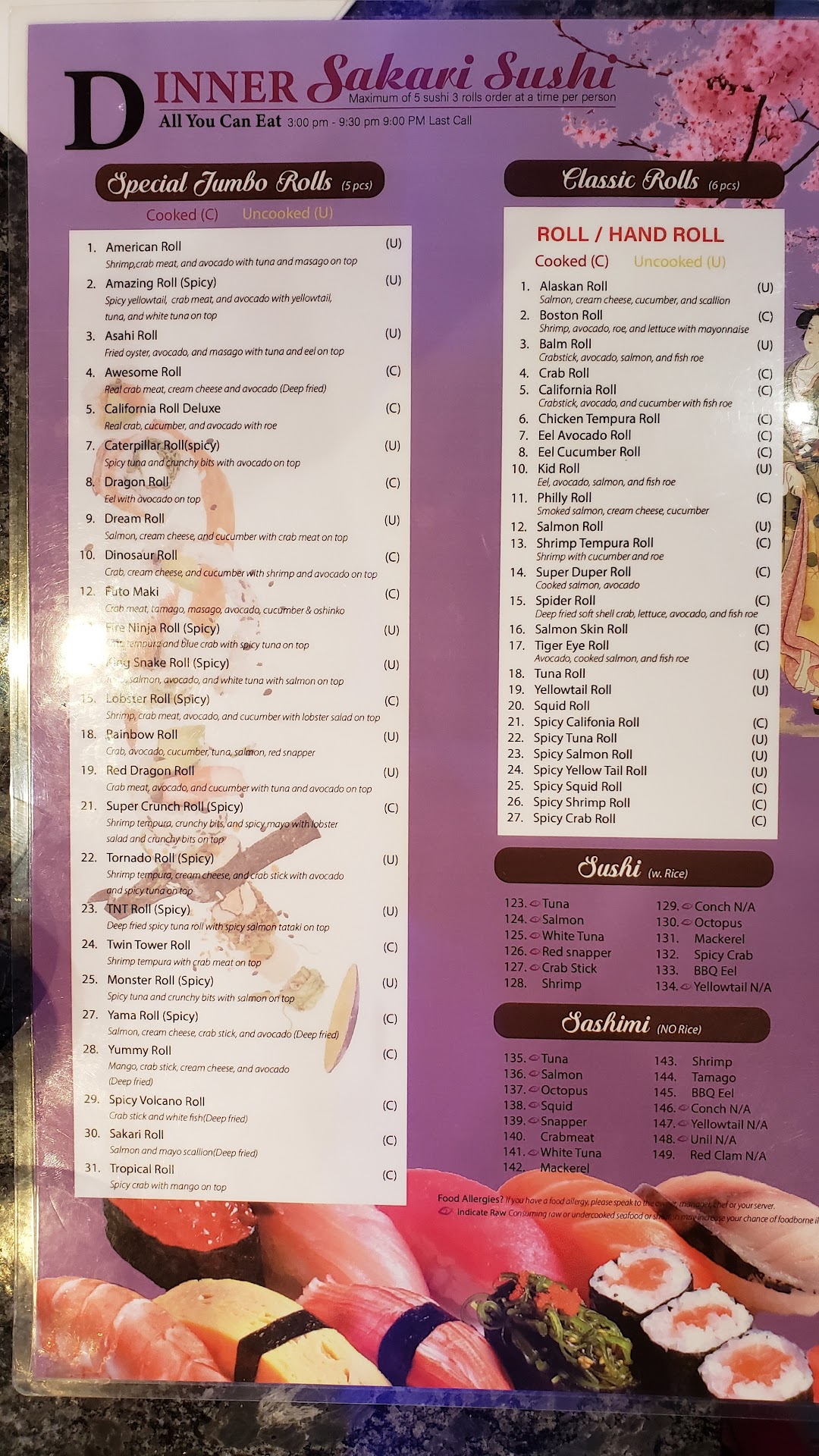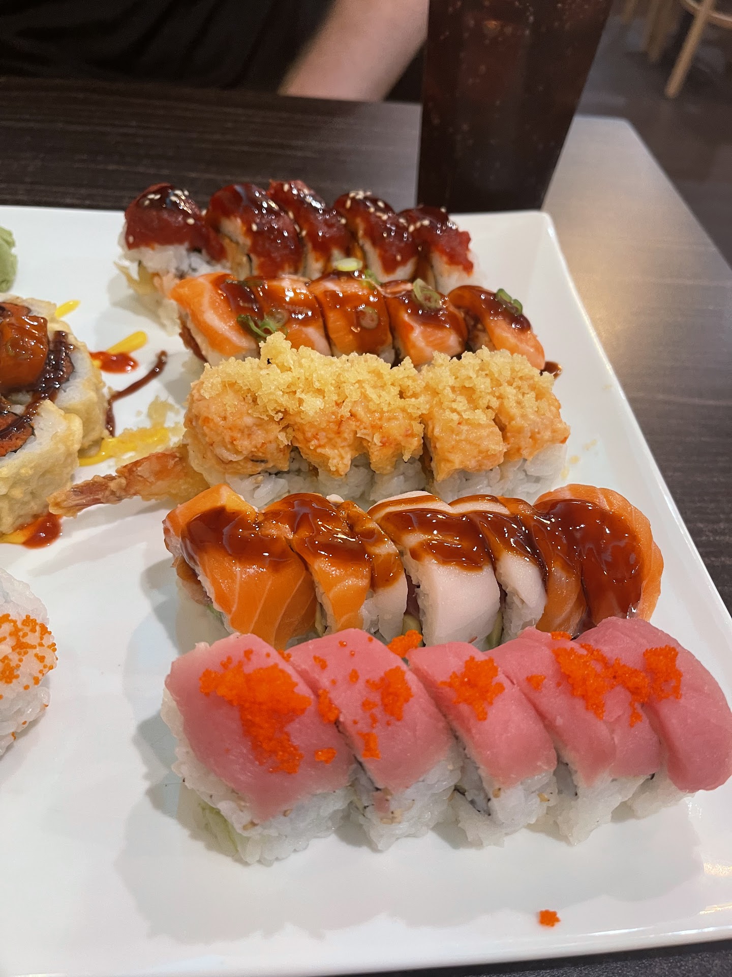 Read moreAbsolutely terrible. Right off the bat, took 15 minutes for server to bring us drinks with 8 tables. Misleading descriptions "crab" used on many things is not crab at all, random fillers in things like lettuce in the "spider roll". "Masago" as topping is the worlds smallest dash of eggs and subpar ingredients and they did not/ would not serve a masago roll. Tried to order a simple cucumber roll and asked for cream cheese added and they said it was an extra charge ON THE ALL YOU CAN EAT when nearly every other roll has cream cheese... like holy cow you are already charging $32 a person for mostly rice and a tiiiiny sliver of fish and fake crab. Whatever mayo they use in their sauces is thick and greasy, not japanese mayo. The result of the cheap gross mayo meant all their mayo based sauces were absolutely foul and they put them on things without listing on the menu. I am so dissapointed. Never again. I hope this business closes and i dont say that lightly. This is not sushi, this is a disgrace to japanese food and culture. Oh, and listening the the obnoxious chiming of their take out machine was super cool. At the end of the meal, waited another 10 minutes to get a server to give us our bill. Not worth $80 (100 if you tip them for...
