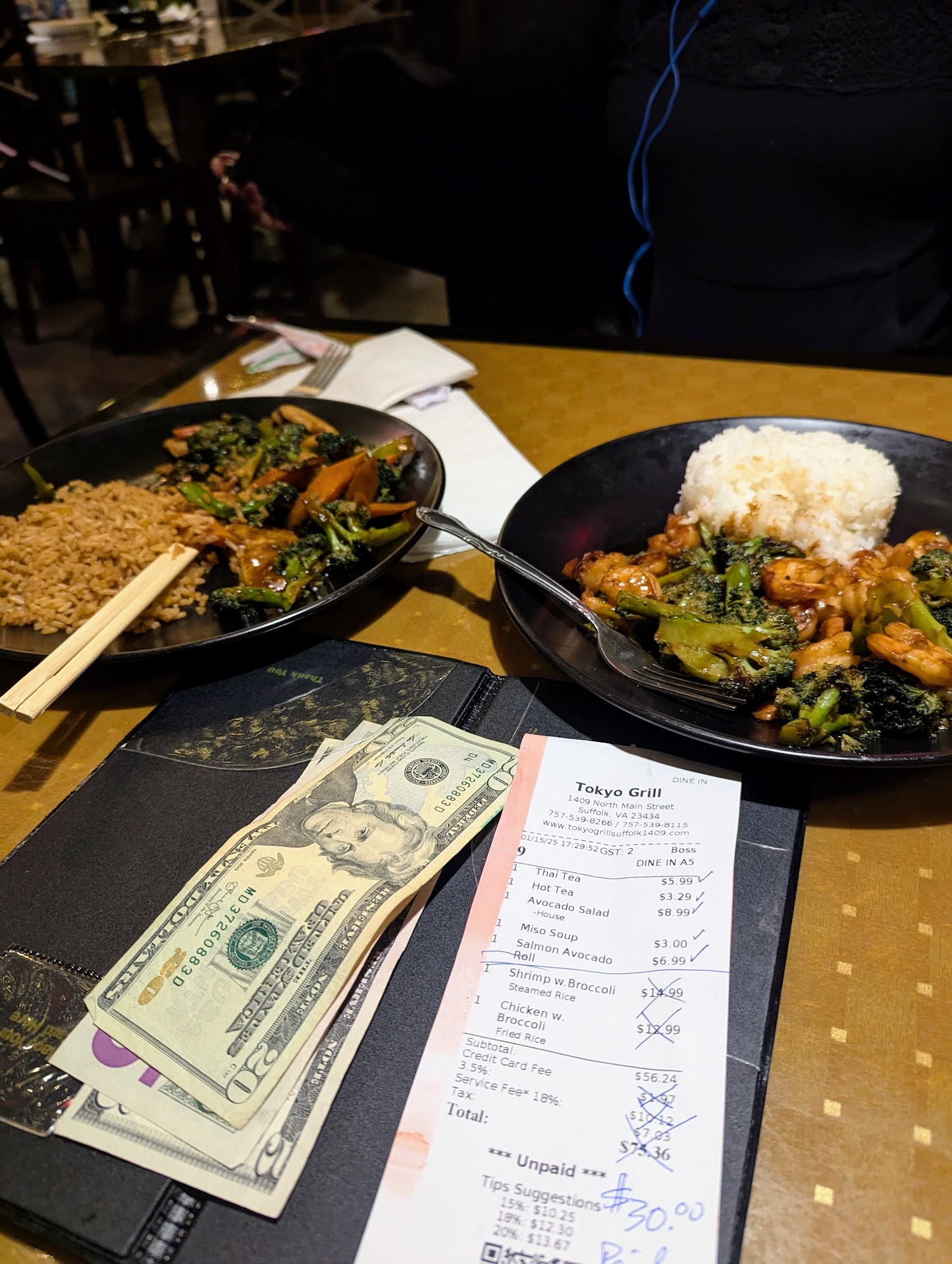 Read moreTokyo Grill on Maine Street in Suffolk is finally open for indoor dining. My wife and I were excited about going back. Prior to COVID we really liked the food and service there. The Chicken and Broccoli and the Shrimp and Broccoli were favorites. This afternoon we went back and had Chicken and Broccoli and Shrimp and Broccoli. The Broccoli was over cooked, the chicken didn't taste good and it was way too salty. Miso soup wasn't as good as before, avocado salad was drowned in dressing, sushi was good. Although not all great we ate everything except for the chicken and shrimp broccoli dishes. When the waitress asked how we liked the food my wife told her that the broccoli was over cooked and I told her it was too salty. The waitress laughed and said "so sorry". My wife said we aren't paying for something that isn't good and we didn't eat. Waitress said we had to pay. We told her to call the police which she did. Two Suffolk police officers showed up and very professionally negotiated between the parties. We offered to pay for the food that we ate, but the restaurant wanted to press charges for petty theft. We said go ahead, we hadn't stolen anything. After the police talked with them they agreed not to press charges, we paid the $30 for the food we ate and they still tried to get their 18% "service fee". Didn't pay it. Other restaurants would have not changed for the food we didn't like or eat and some would even give a discount coupon to return and give them...