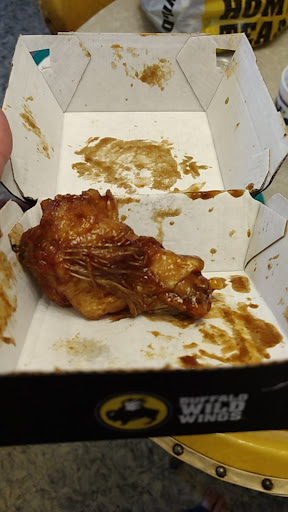 Read moreI like Buffalo Wild Wings. I do. But this location just can't seem to get it together. Whether its rude staff or order screw ups or later than stated order times. All that aside I decided to give this location a shot as it's on my way home and of course, wing Tuesday. That was a mistake. The girl that answered my call for pick was alright. She was polite and took an accurate order. That's worth a couple stars. However everything else after erases all that. I go to pick up, when it's my turn the server starts going over my order and then proceeds to argue about what's on it. Turns out she skipped one and instead of admitting it, she just shrugs and says well that's all I have (upon checking everything before leaving, not actually opening boxes mind you, it's all there). Now home, 20 mins away from your location we start to divvy up our order and the first one we open, (see pic below), the teriyaki, has a wing that is still half feathers. Now I've worked in food. Sometimes this happens. And you throw that piece out at your restaurant. If it was a small little piece I could see not catching it but this is half a freakin wing. Needless to say I will most definitely not be coming back to this location and probably won't be getting wings for...
