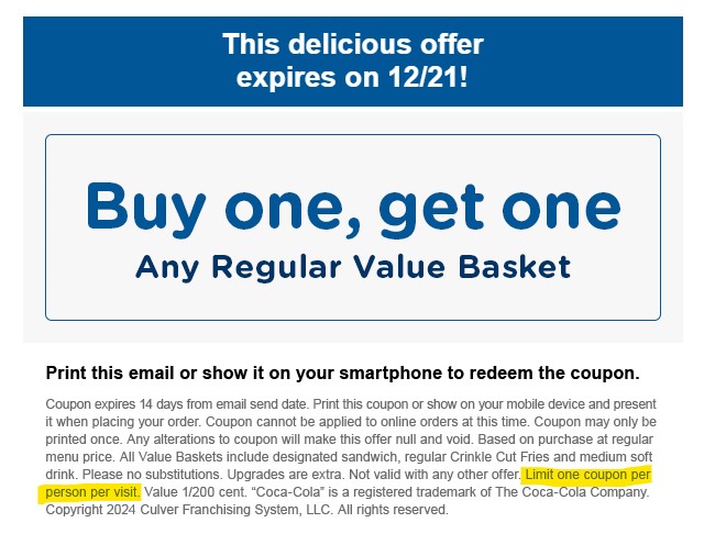 I rolled down my window and told said employee that Culver's staff and management was knowingly instructing drivers to park illegally. Culver employee rudely advised me that because this was private property, laws do not apply to Culver's staff. I pointed out that Culver had painted / postered arrows themselves on the private property street, so they were also not following their own posted policy and procedures.