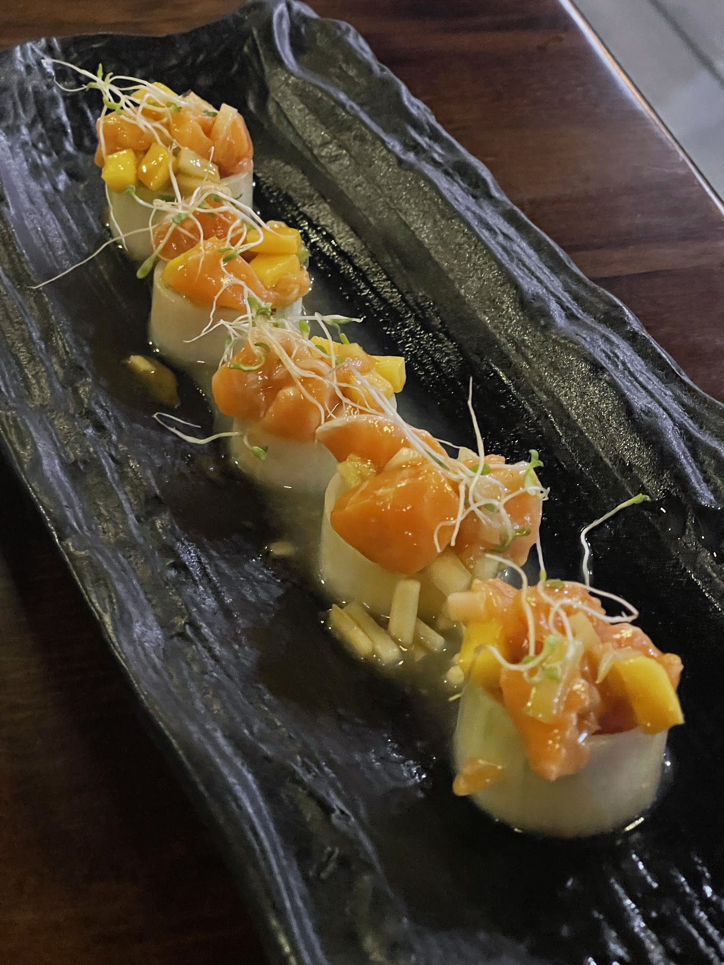 Read moreCuriosity of the “French” in the name brought us here. Beautiful platting irl was comparable to all the pics we saw prior. Elly and I had mix take on this place. They have an omakase that you need to reserve ahead of time but also have a menu called omakase that had individual items to order (2pieces) per item. We went and ordered purely on pictures we saw in other posts. Because we didn’t know the names and what they actually were, some of the dishes were very similar to each other. A lot of the sushi type dishes had a vinegar and/or yuzu flavor which I liked but Elly didn’t. If we had better dish understanding, we may have had better ordering selections. I did enjoy the beef tataki which had exact same sauce as the salmon tataki. Also liked the spicy tuna tartar (forgot to take pic) and the Black Cod itself. Delicate Scallops had same bottom base as the cod but different sauces. Everything else was very similar in taste which ended up being a bit too much and boring for us. Again, this may be our fault for ordering similar items. Place was busy dine in and take out. Really wished we were into the rolls which appeared to be very popular. If it was closer to us, I would totally order take out to get a chance to try to fix our misguided...