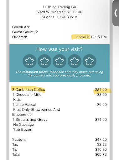 Itās with a heavy heart that I write this review⦠I left Rushing Trading Co. in tears today because of how I was treated by the manager Jason. Iāve been coming to Rushing for over a year now. Itās become our go to place. The food is great and so is the coffee! Along with the atmosphere. With that being said, I was overcharged for my Caribbean Coffee (my usual- for the last year or so) today. So I brought this to my waiters attention, she consulted with the manager, Jason, who then came outside to my table to belittle me. When he approached me, I tried to show him multiple recent receipts on my phone where Iāve been charged $12 for the Caribbean coffee (now trying to charge me $20!). He had no interest in viewing it. His attitude and tone when speaking to me was so disgusting and unprofessional. As a manager, this situation shouldāve been handled very differently. Hell anyone with human decency couldāve handled this situation better than he did. Not to mention out of the nearly 70+ times Iāve been to this restaurant in the last 14 months, Iāve never once had any issues/problems. Iāve spent a total of $3831.47 at this establishment. (Not to mention what my friend who also always comes with me spends ā and the people weāve introduced and brought here) And yes! I do have receipts to prove this!! And yes! I did go back and calculate it because I was in such disbelief of how this so called manager spoke to me. As anyone whoās been to this restaurant knows you can have the receipts texted to your phone. So clearly, I wasnāt trying not to pay for what I ordered. What I wasnāt going to do, is be blatantly overcharged. $8 increase per drink! Absurd!!