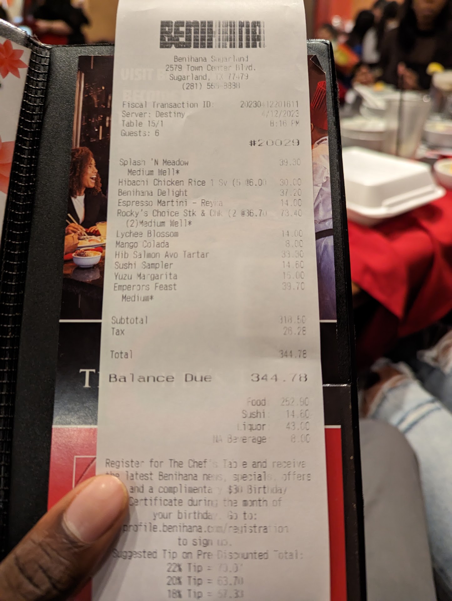 Read moreOur office is located in the Sugarland area, and wanted to have a different vibe this year for our office Xmas Dinner. I suggested we come to Benihana's as I've always had a great experience. Boy was I wrong, and embarrassed this time. First red flag was our waiter. I have nothing against new people, but he was all over the place bothering the chef multiple times with questions while cooking. Looking at the chef's face he looked annoyed, but tried to be nice. He got my order wrong, and also never brought my co-workers their steam rice with their meal. My chef never gave me my fried rice, and my waiter was just like oh it's ok I'll grab it from the back. You know the best thing at hibachi is the rice cooked in front of you - FRESH! The waiter grabbed some from the back kitchen, and it wasn't the same. The manager came around, and asked us how was everything. Of course I said the part of the rice. He never apologized, only smiled, and said well we can get it from the back. The issue again with that is not the same! The other people we didn't know also agreed how it was bummer that it wasn't cooked fresh like theirs, and tasted different. I ordered the lobster and filet, and the lobster was too salty, and my filet was OVERCOOKED (I ordered med rare, and got med to well). To have such a bad experience with my meal over $50 plus drinks. No thank you! Never coming back! I will never suggest this place to...