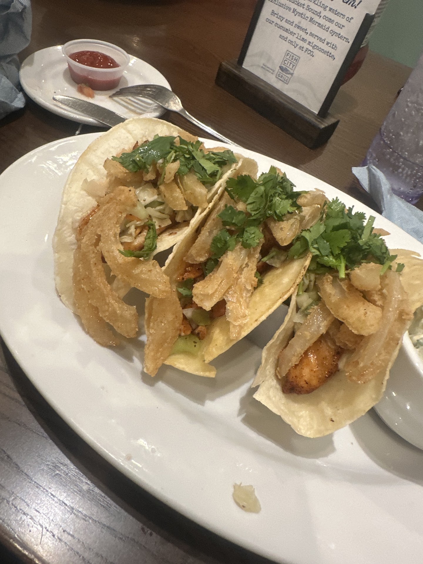 We ordered the fish and chips, honey chipotle shrimp tacos, crab bisque cream, clam chowder, and let me start by saying when you come in restaurant "it doesn't smell fishy!" That's a big plus for me!!! Because fishy is not good...