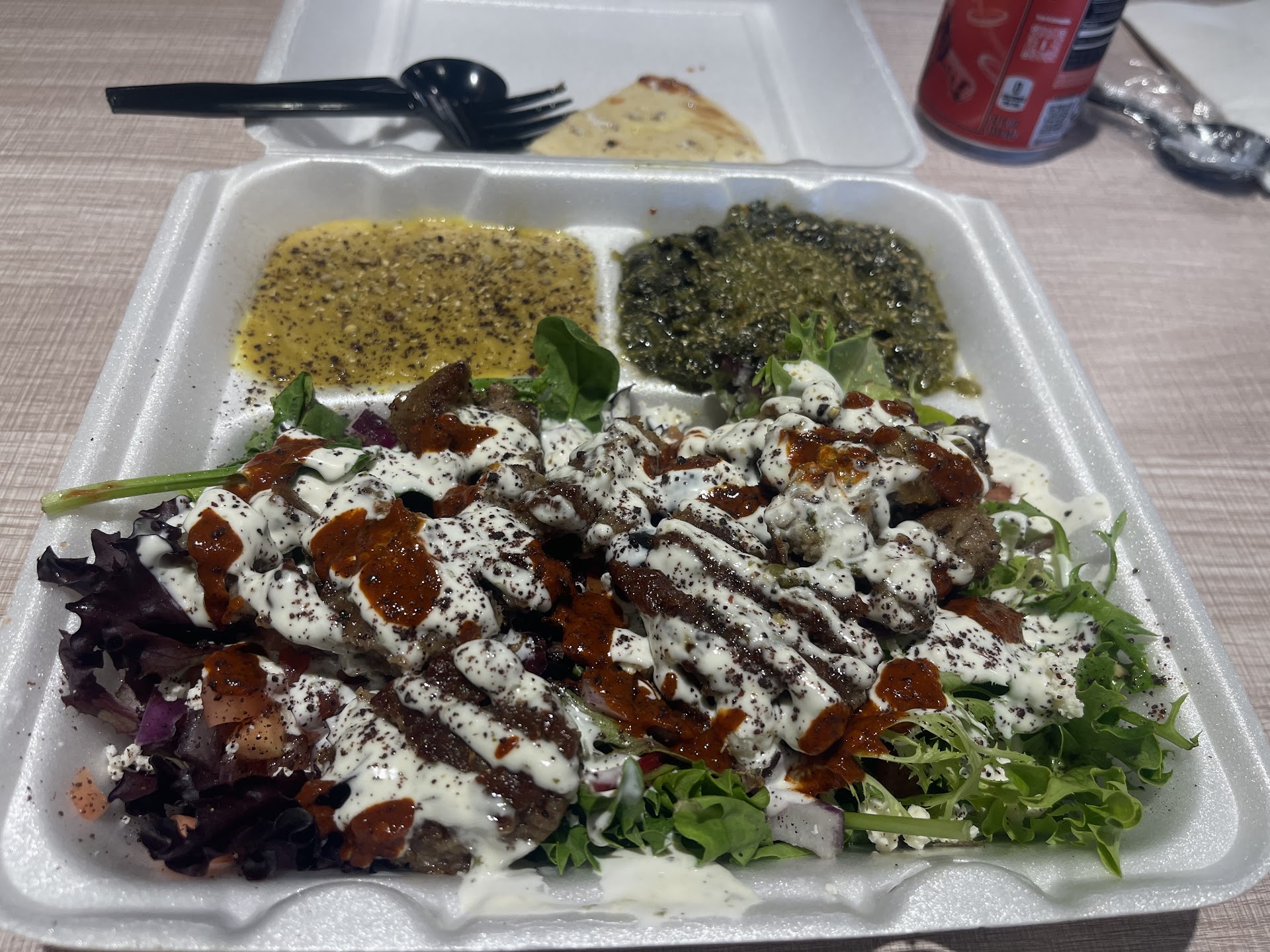 The bed of salad wasnât just âfluffâ like nasty iceberg lettuce or not even romaine lettuce. It was a nice bed of already dressed mixed greens (baby spinach, arugula, radicchio, etc.) with diced tomatoes and onions. On top of that, they laid the meats and dressed the meat further with white and red sauce.