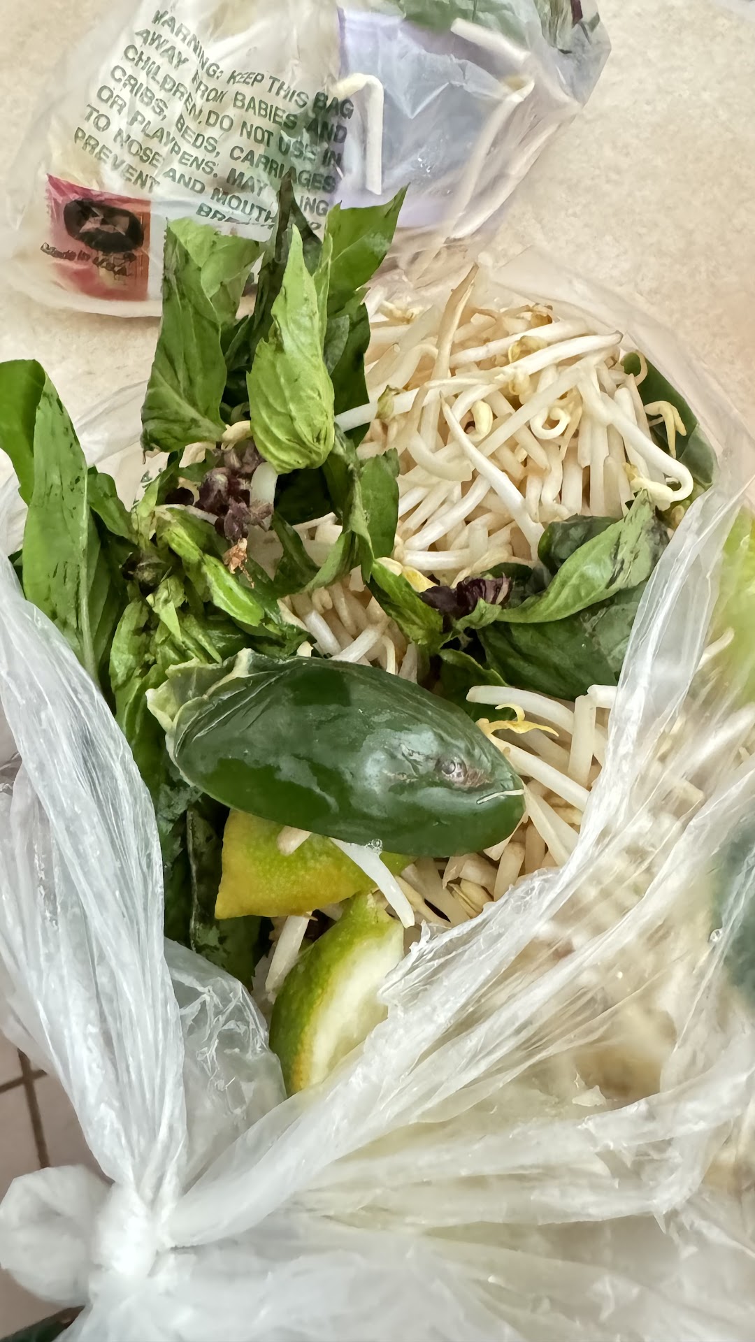 Unfortunately, my instincts proved to be correct, and I should have walked out. The pre-packaged bags containing bean sprouts, basil, and jalapeños were visibly ruined, as evidenced by the attached photos. Additionally, the grilled chicken seemed days old and was incredibly tough—I struggled to even cut it with scissors. Certain parts of the chicken were alarmingly hard, indicating overcooking and potential reheating in the microwave.